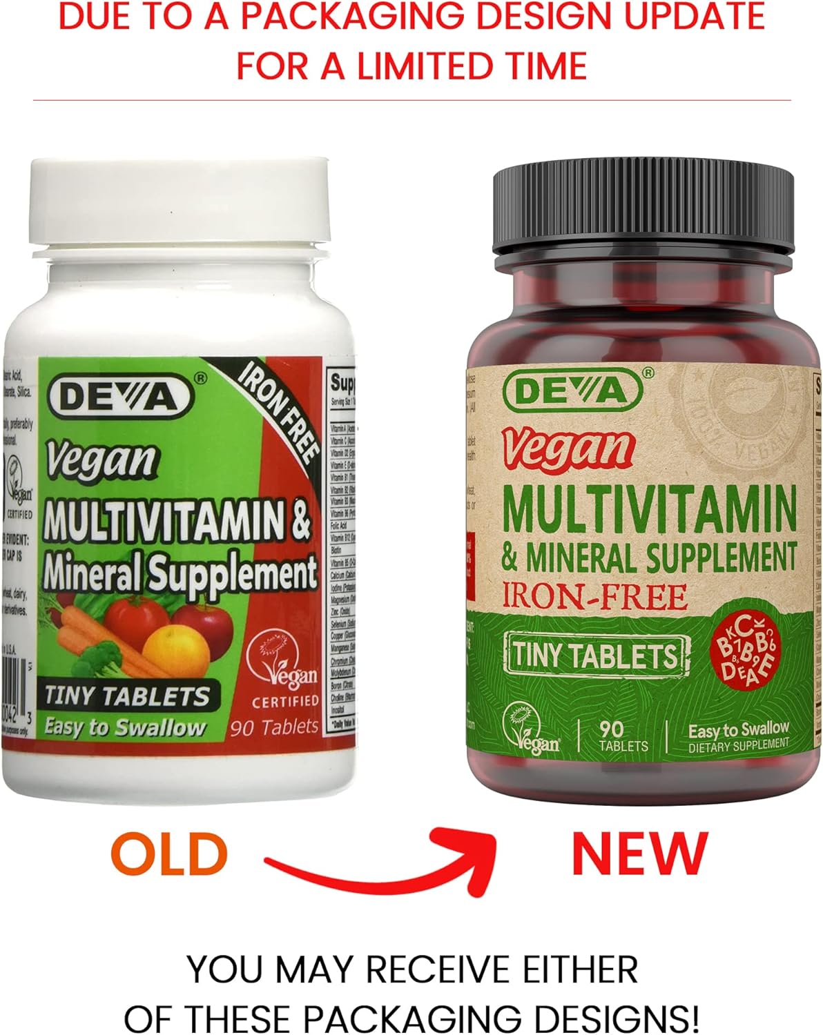 DEVA Vegan Iron-Free Multivitamin & Mineral Supplement 2-Pack, Vitamin C, D2, E & B-Complex, Biotin, 90 Tiny Tablets Each