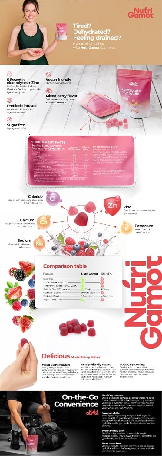 Electrolyte Hydration Gummies Sugar Free | Mixed Berry Flavor – 5 Essential Electrolytes for Runners, Post-Workout Recovery & Endurance – Energy Support Chews, Great Taste, 60 Gummies