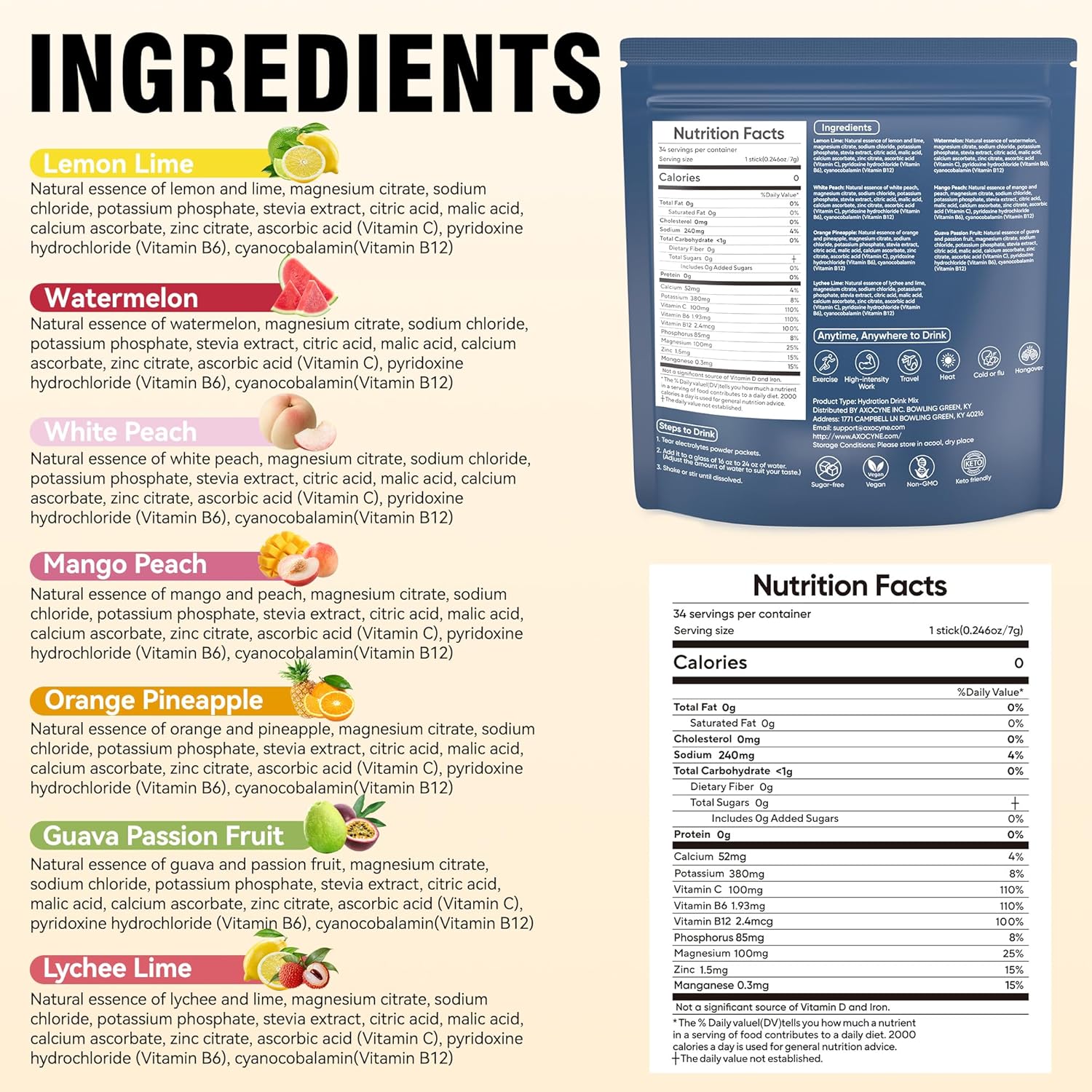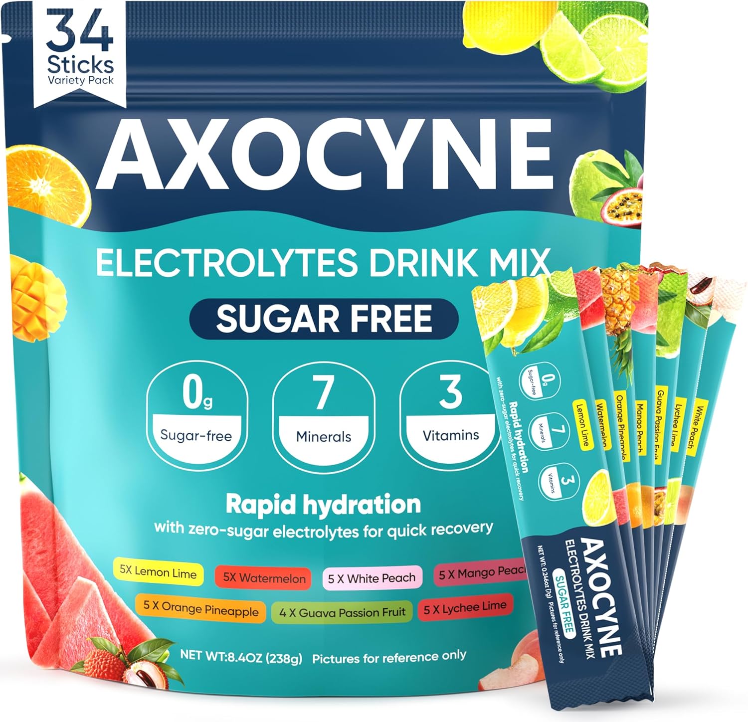 Electrolytes Powder Packets Sugar Free, 34 Sticks Hydration Packets Liquid Daily IV Electrolyte Drink Mixes with Potassium & Magnesium, Rapid Rehydration, Zero Sugar, 7 Flavors