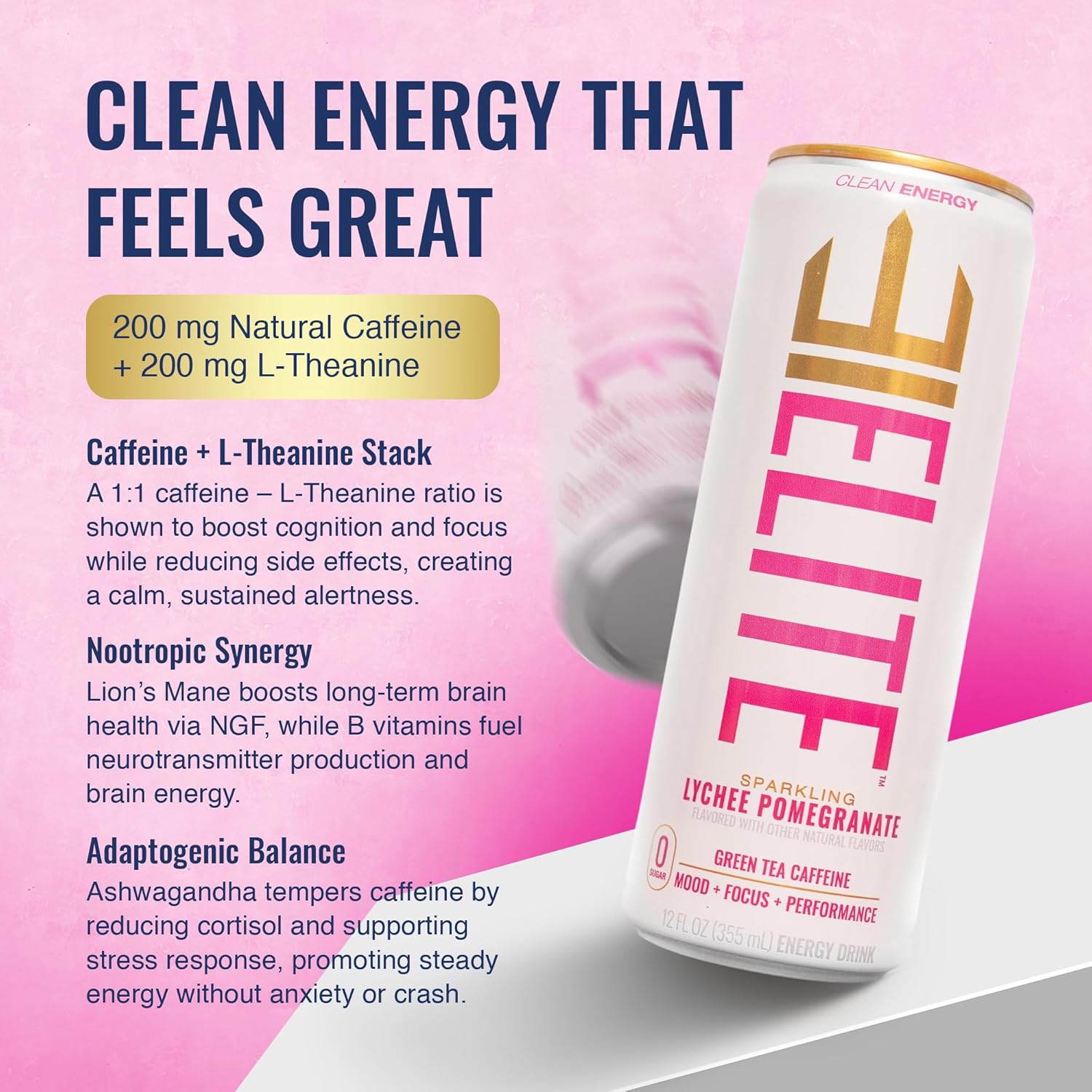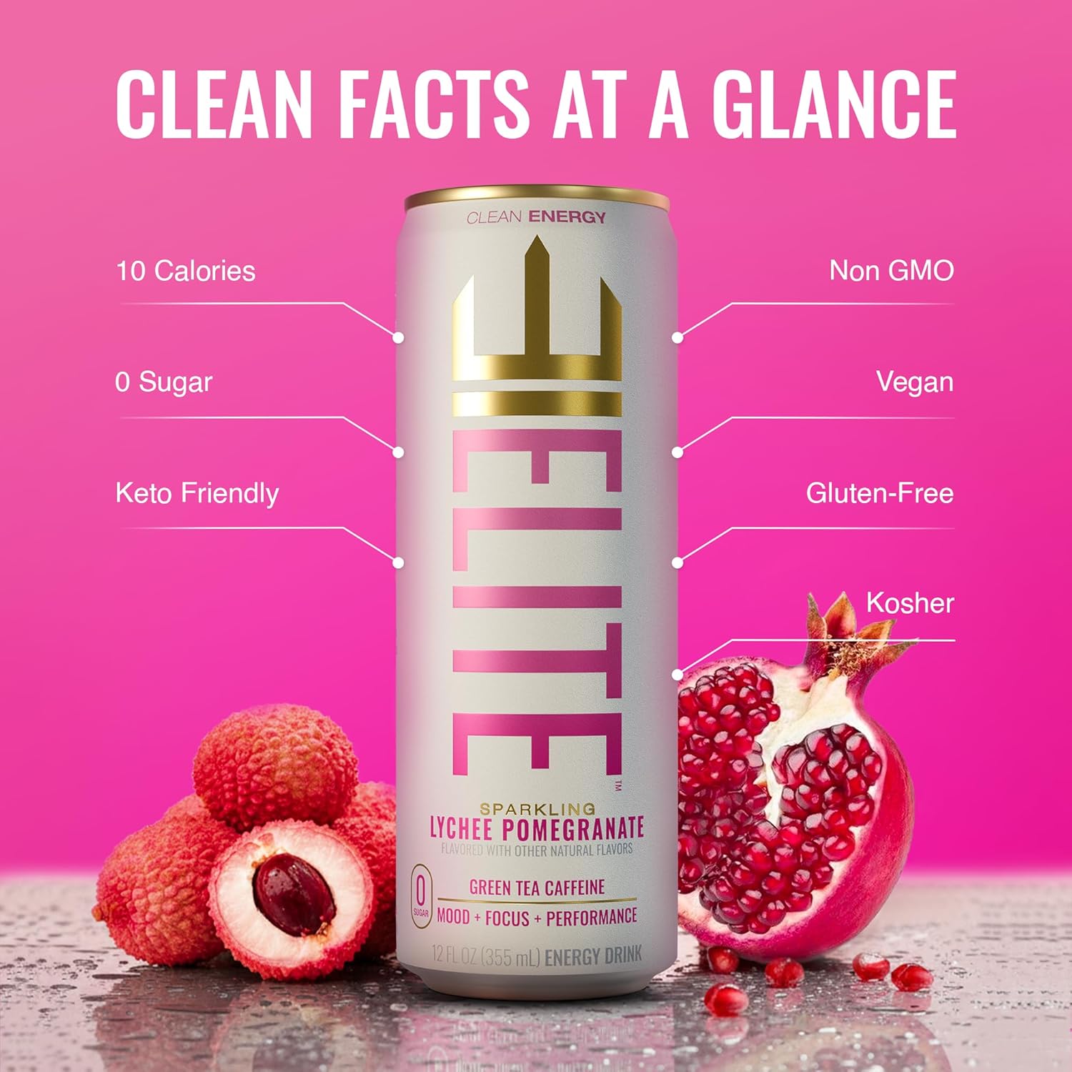ELITE Energy – Sugar Free Energy Drinks – Clean Green Tea Caffeine with L-Theanine – Zero Sugar, 10 Calories, Naturally Sweetened Functional Energy – Focus & Performance – 12 Pack – Lychee Pomegranate