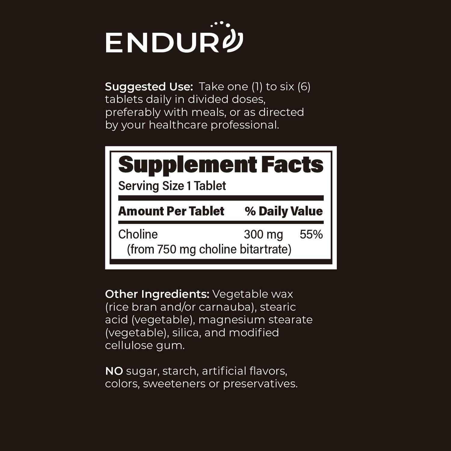 ENDUR – Choline L(+) Bitartrate – SR (Sustained Release) 300 mg – Brain, Liver, Cellular & Fetal Development – Pregnancy Support – Optimal 6–8 Hour Absorption Delivery – 200 Tablets