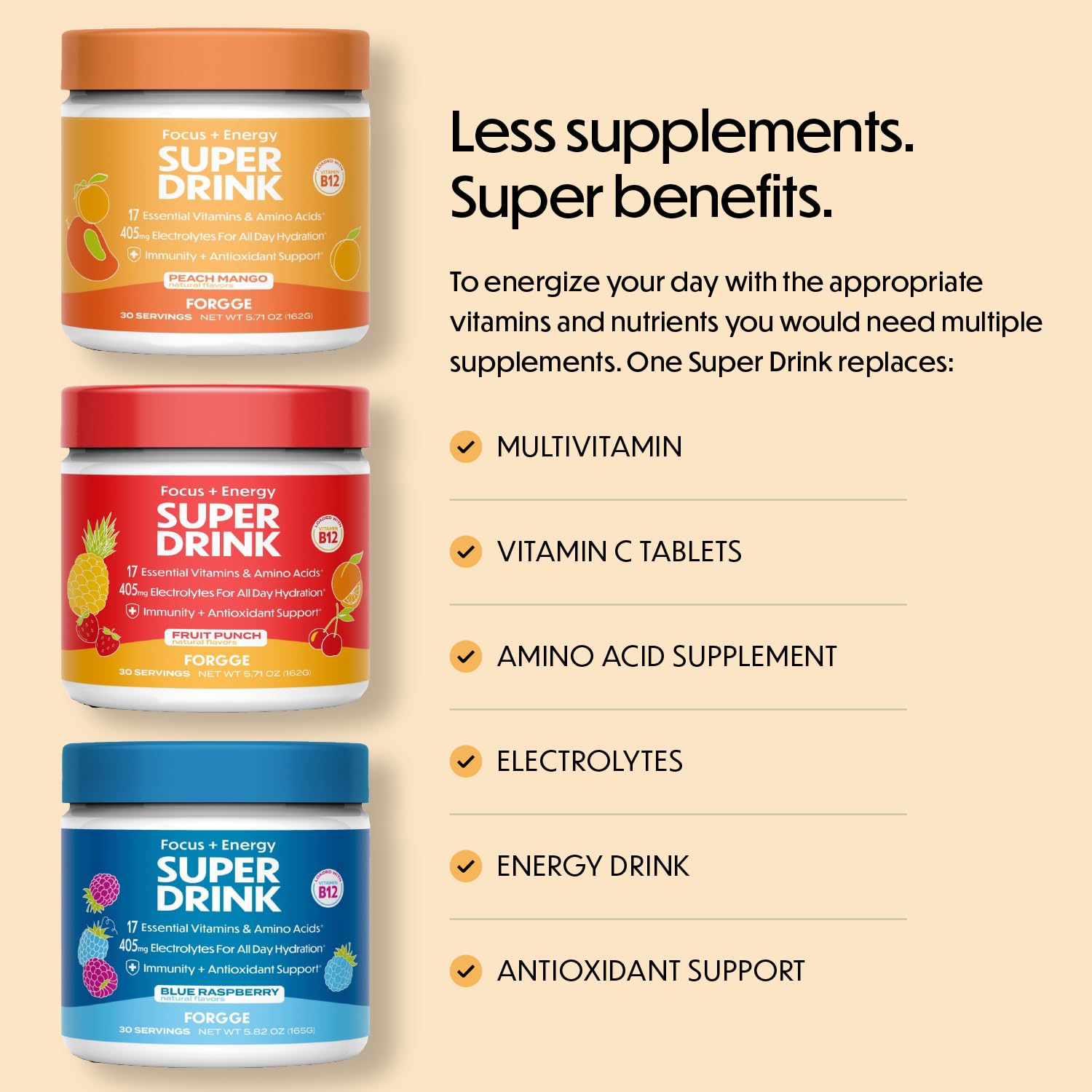 Forgge Healthy Energy Drink Powder Mix – Clean Caffeine + B12, B6, C & D Vitamins – Sugar Free Energy Drink Powder with Electrolytes, Amino Acids, Antioxidants, Lions Mane – Vegan, Keto-Friendly – 30 SVG, Fruit Punch