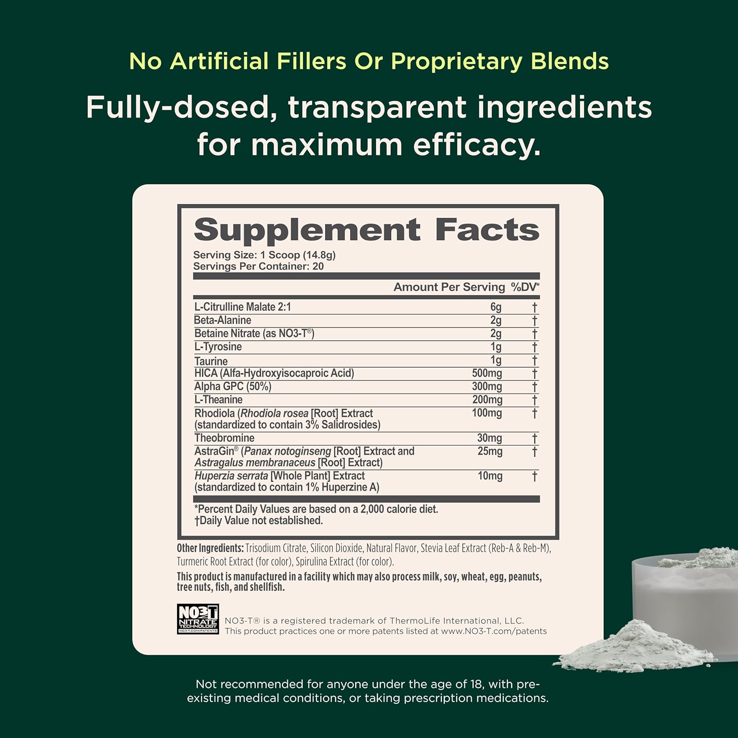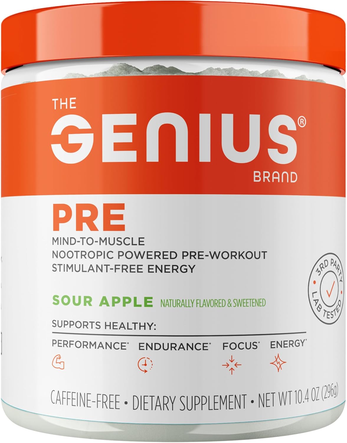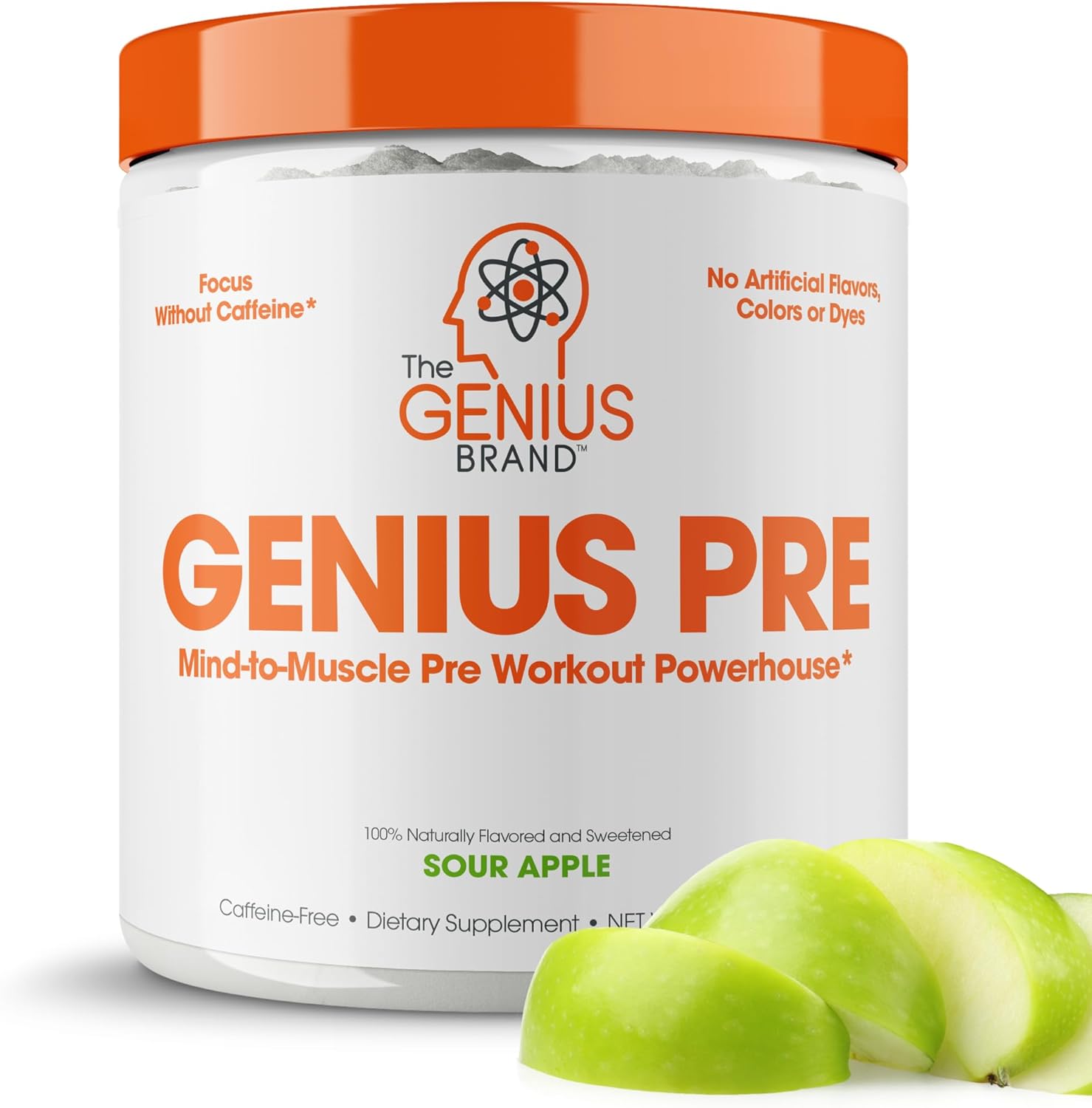 Genius Pre Workout Powder, Sour Apple – All-Natural Nootropic Pre-Workout & Caffeine-Free Nitric Oxide Booster Supplement with Beta Alanine & Alpha GPC – No Artificial Flavors, Sweeteners, or Dyes