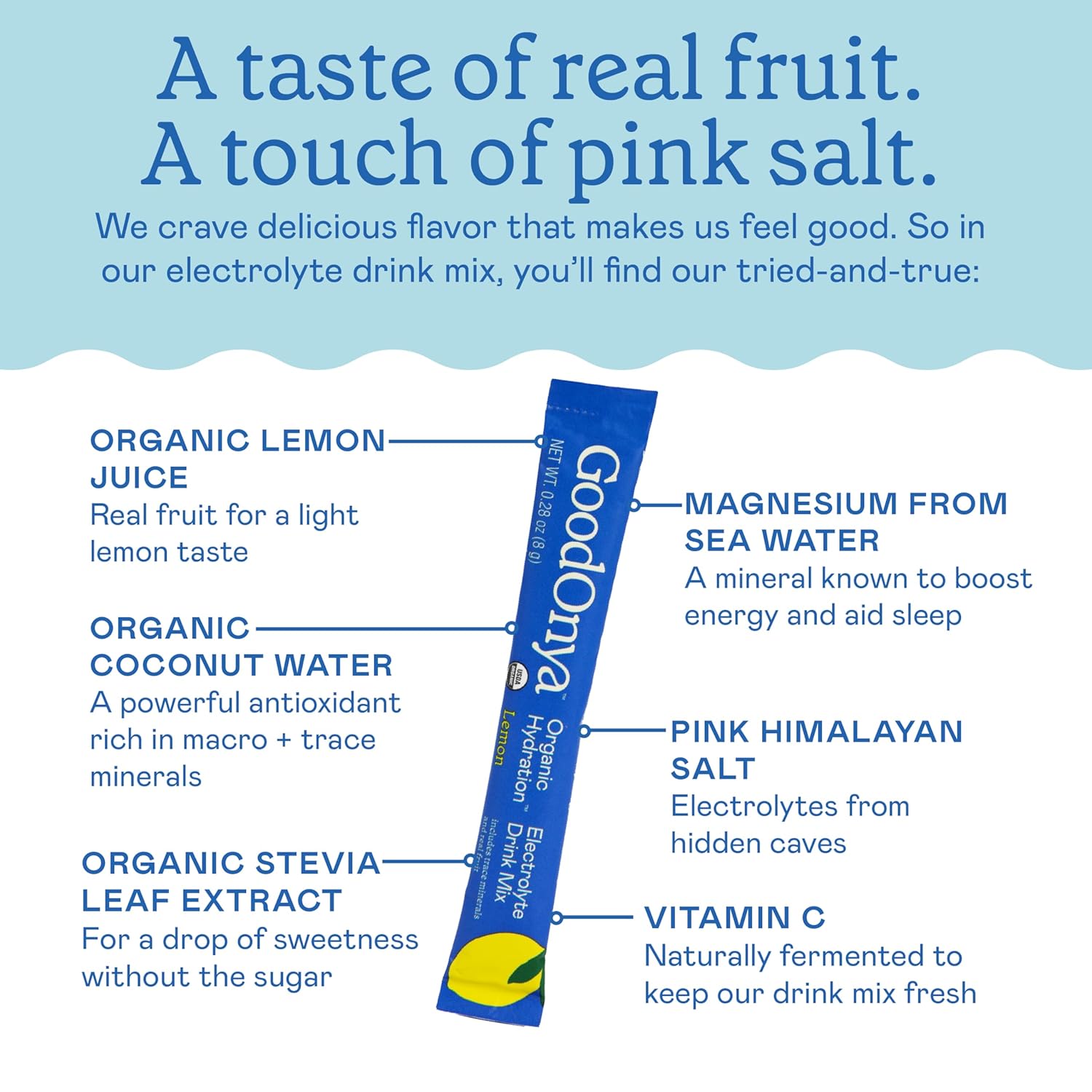 GOODONYA Organic Hydration Electrolyte Drink Mix, Certified Organic Hydration Powder, Non-GMO, Biochecked Glyphosate Free, Low Sugar, Lemonade Flavor, No Artificial Flavors,12 Stick Packs