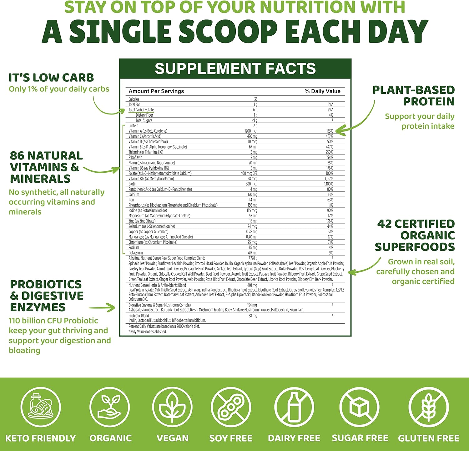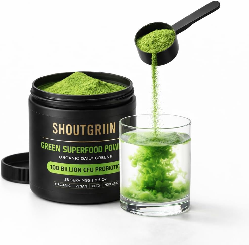 Green Superfood Powder — Organic Super Greens with 100 Billion CFU Probiotics & Digestive Enzymes — Vegan, Keto, Sugar-Free Daily Greens Supplement — Energy, Gut Health & Immunity