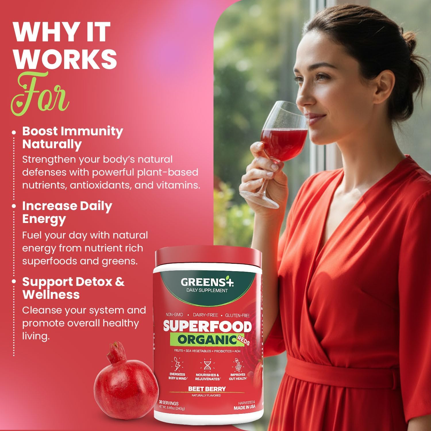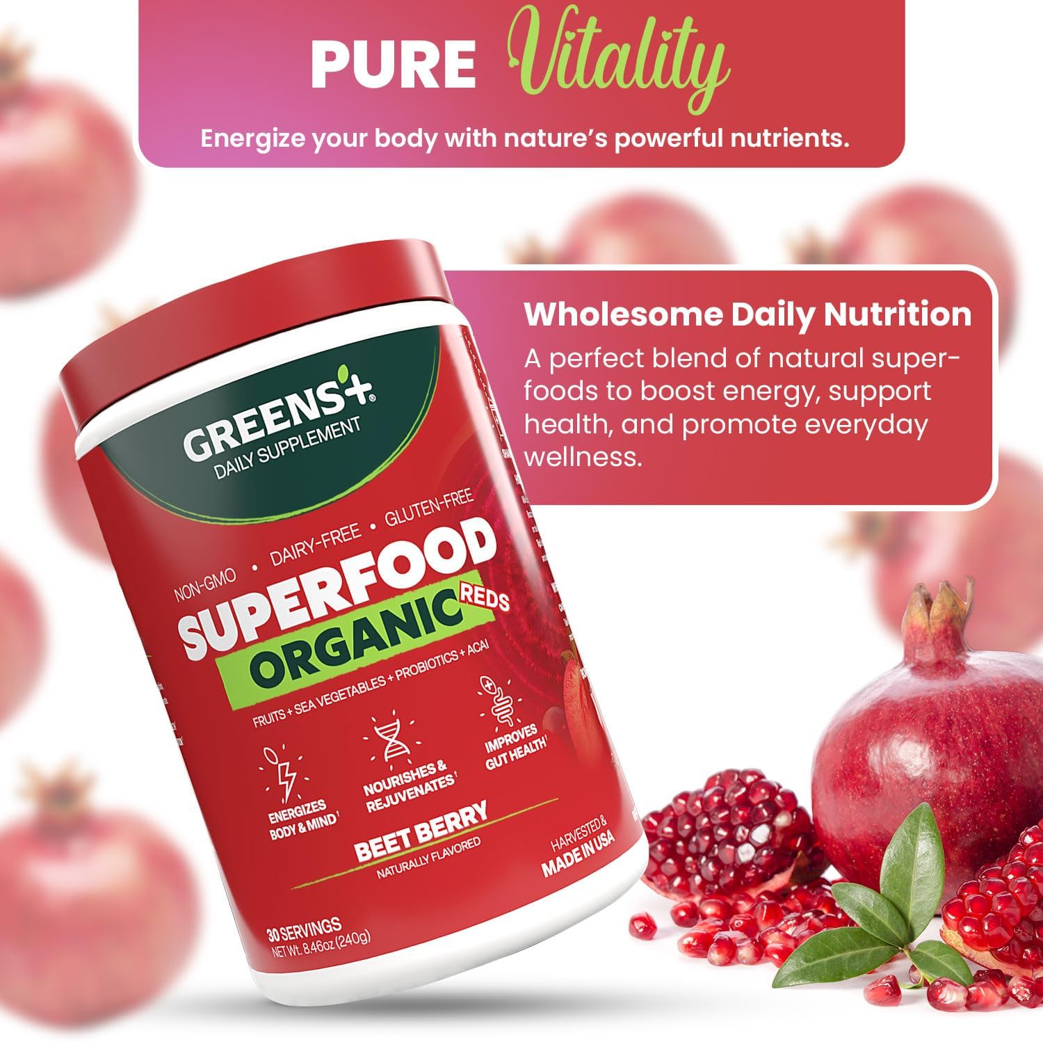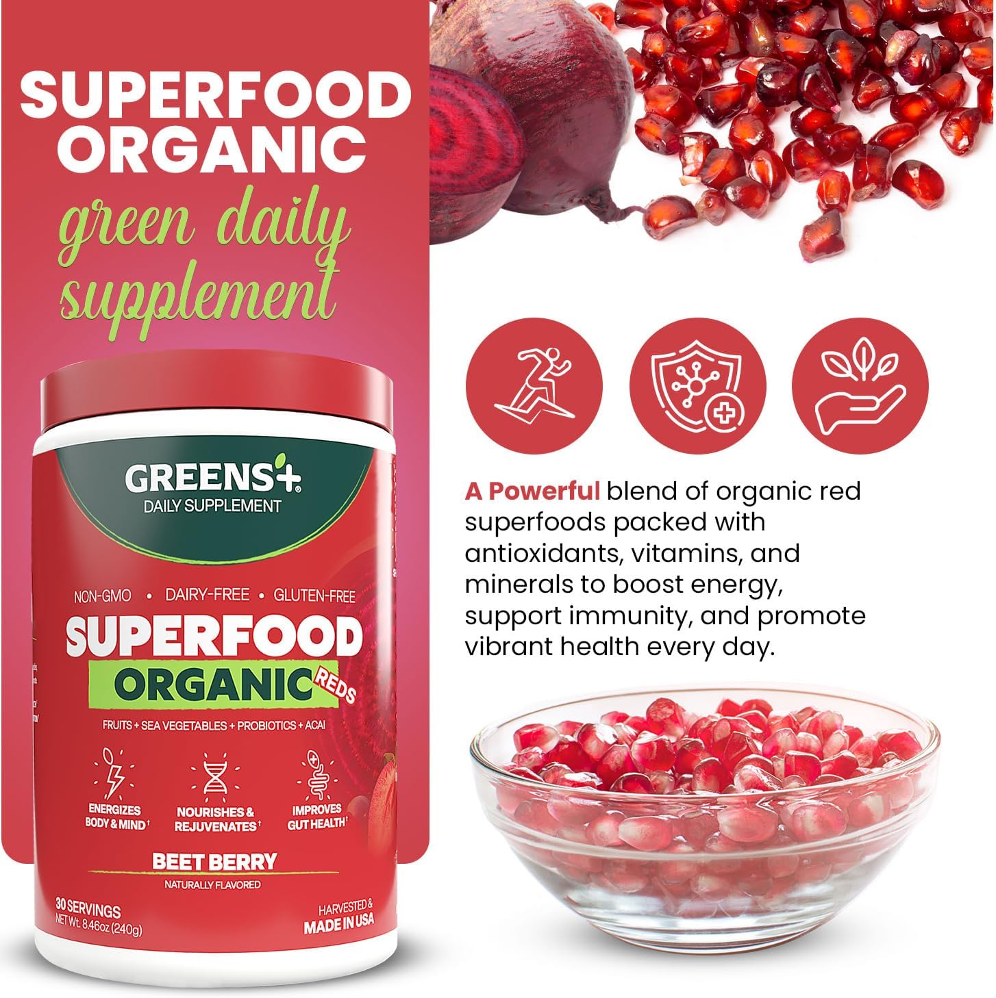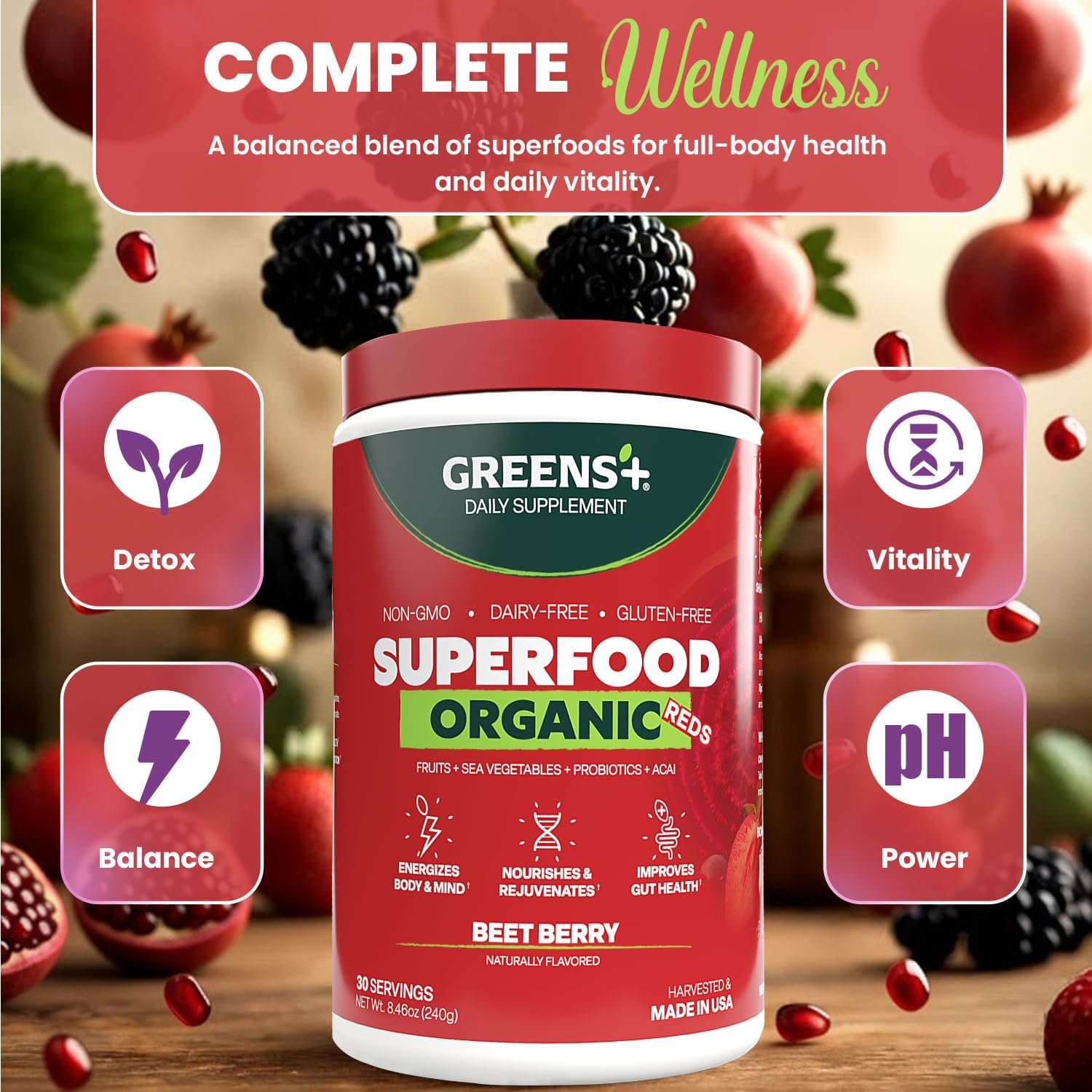 Greens+ Organic Reds Superfood Powder, Antioxidant, Polyphenol, Blend for Morning Kick, Energy, Vitality Boost, Nutrition, Vibrant Health, Vegan Soy/Dairy/Gluten Free(8.46oz)