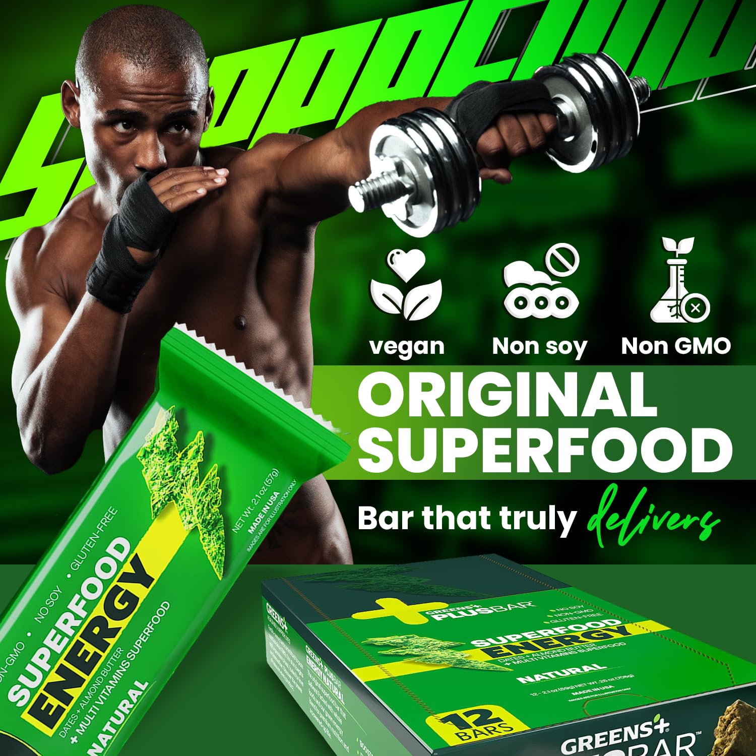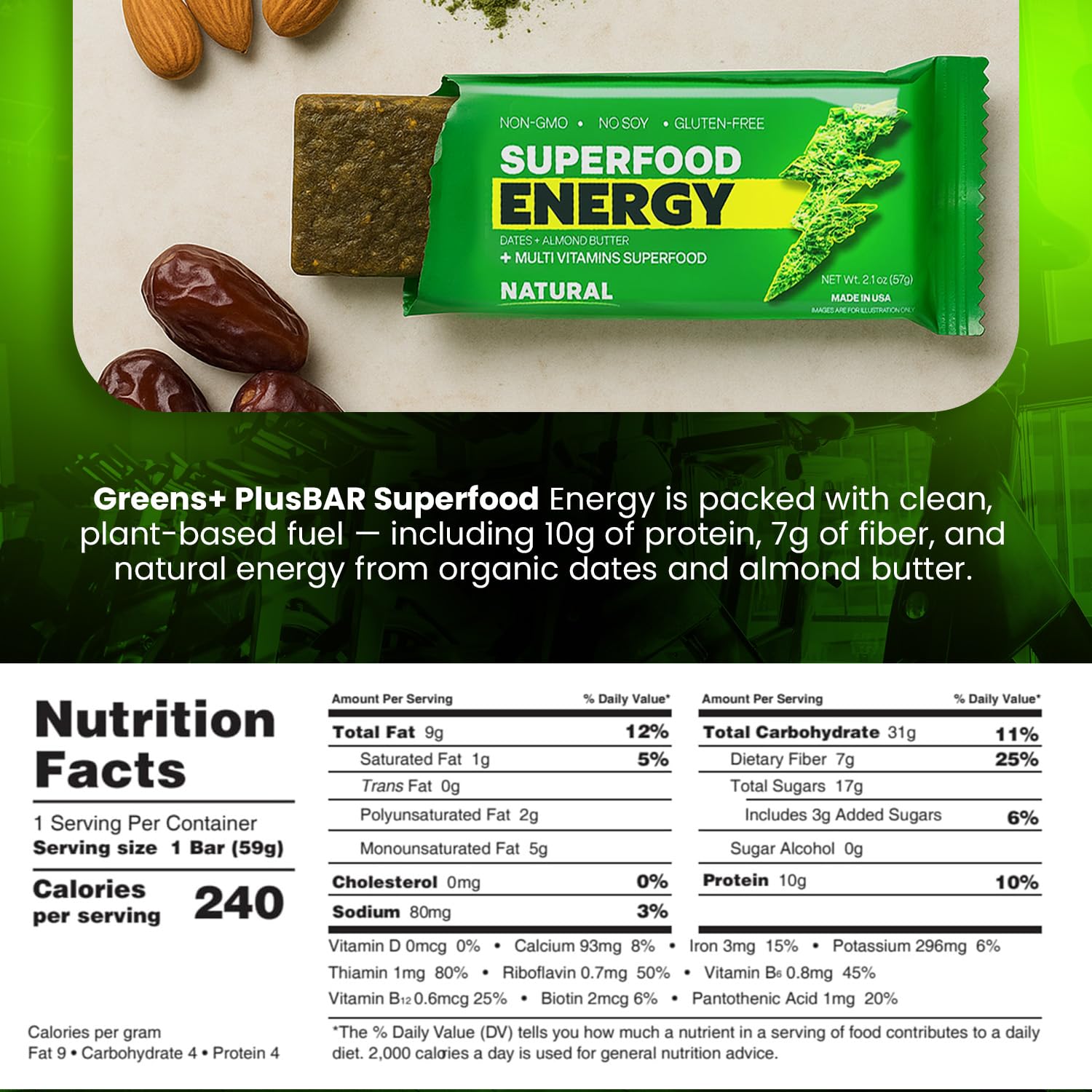 Greens+ Plusbar Energy, Natural, Gluten-Free Snack with Super Greens, Superfoods & Almond Butter, Vegan, Dairy-Free, Non-GMO, 10g Protein Meal Replacement, 12 Pack