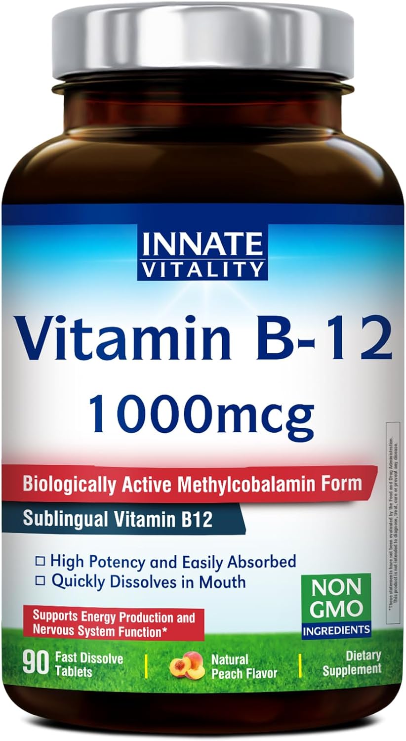 Innate Vitality Vitamin B12 1000mcg, Sublingual Methylcobalamin, for Energy Metabolism, Mental Clarity, Nervous System Health, Peach Flavor, Zero Sugar, 90 Fast Dissolve Tablets