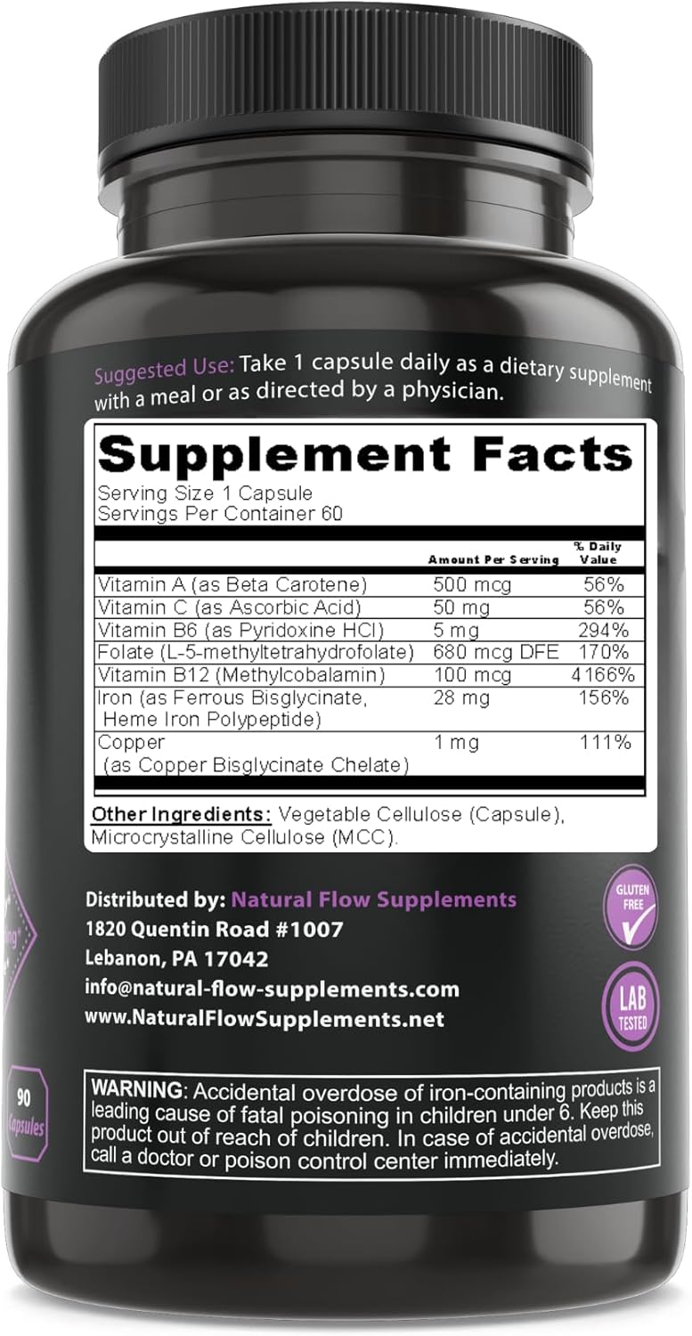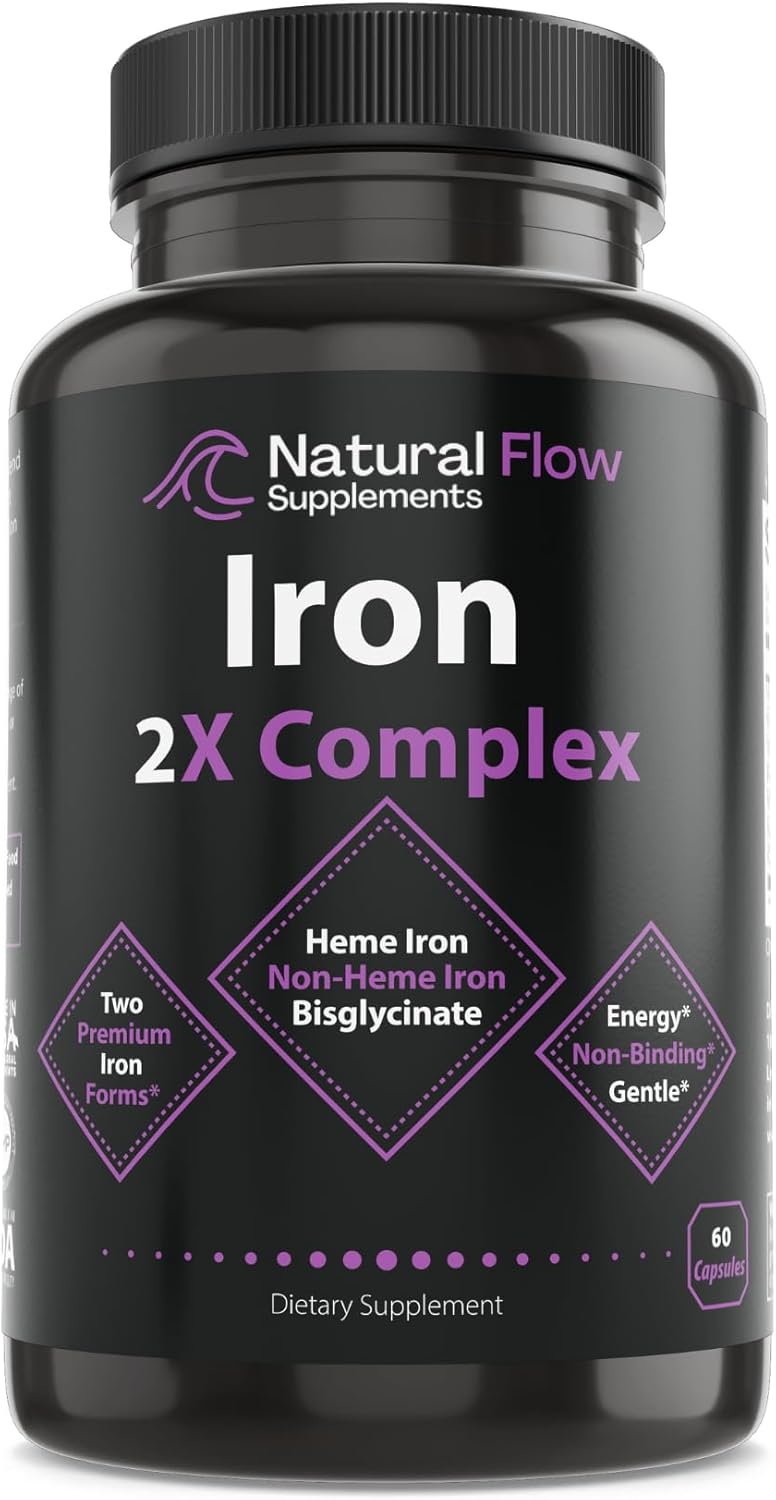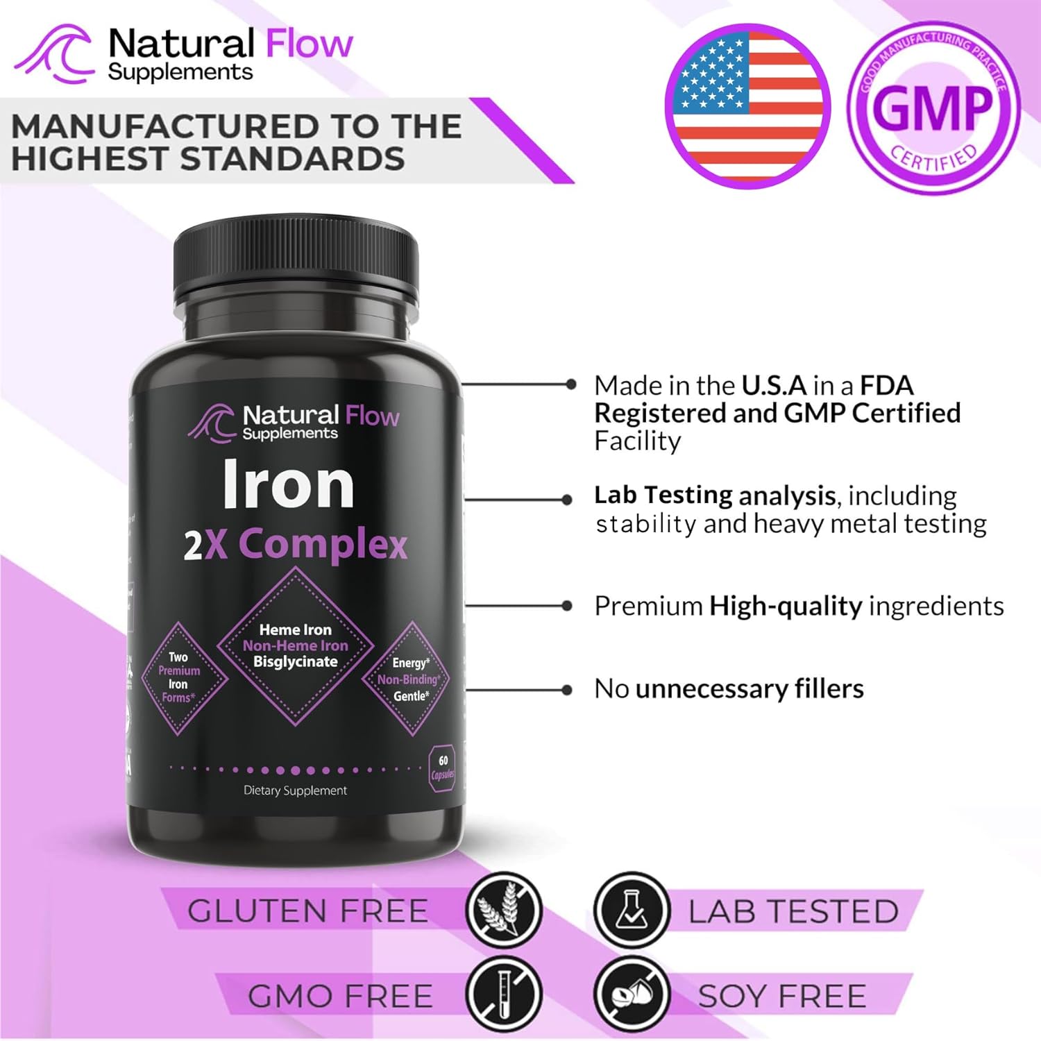 Iron Supplement 2-in-1 Complete Complex – Natural Flow 2X Heme and Chelated Non Heme Iron Bisglycinate, Folate, B and Vitamin C, for Anemia and Blood Building Support, Gentle on Stomach, 60 Caps (60)