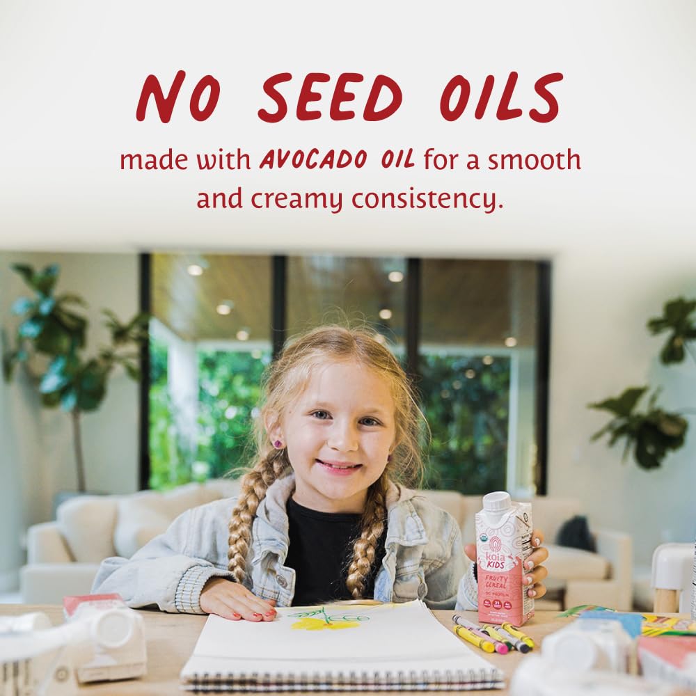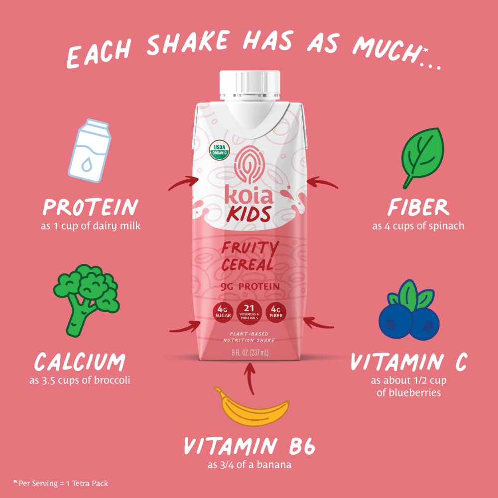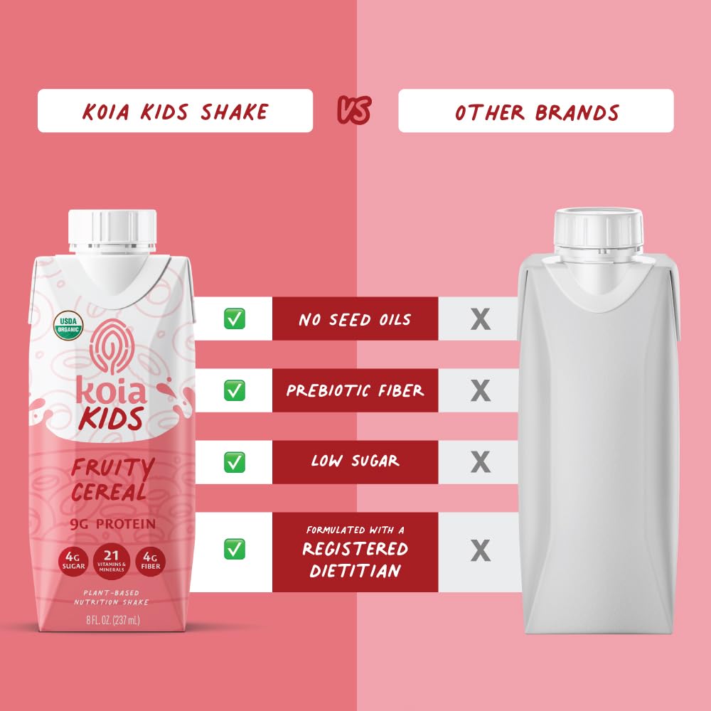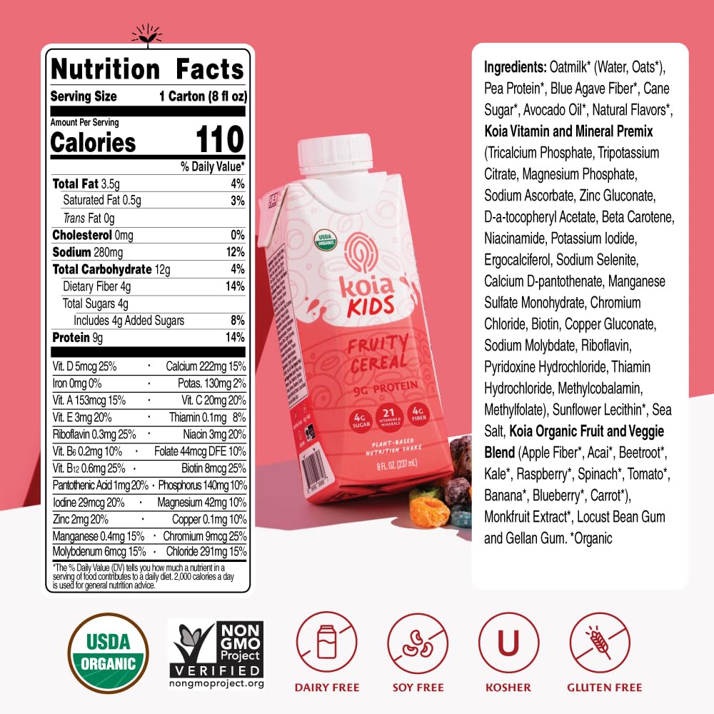 Koia Kids Plant Based Protein Shake, Fruity Cereal, Ready to Drink, 9g Protein, 4g Low Sugar, 4g Fiber, 21 Vitamins & Minerals, Dairy-Free, Allergen-Free, Organic, Non-GMO, 8 Fl Oz (Pack of 12)