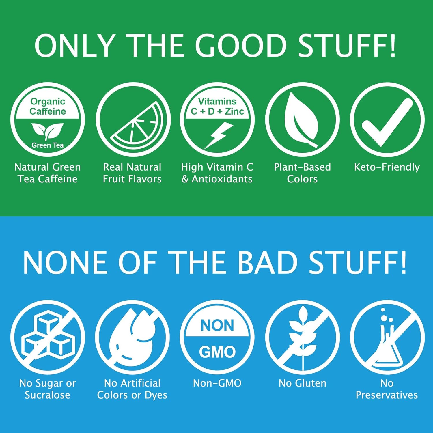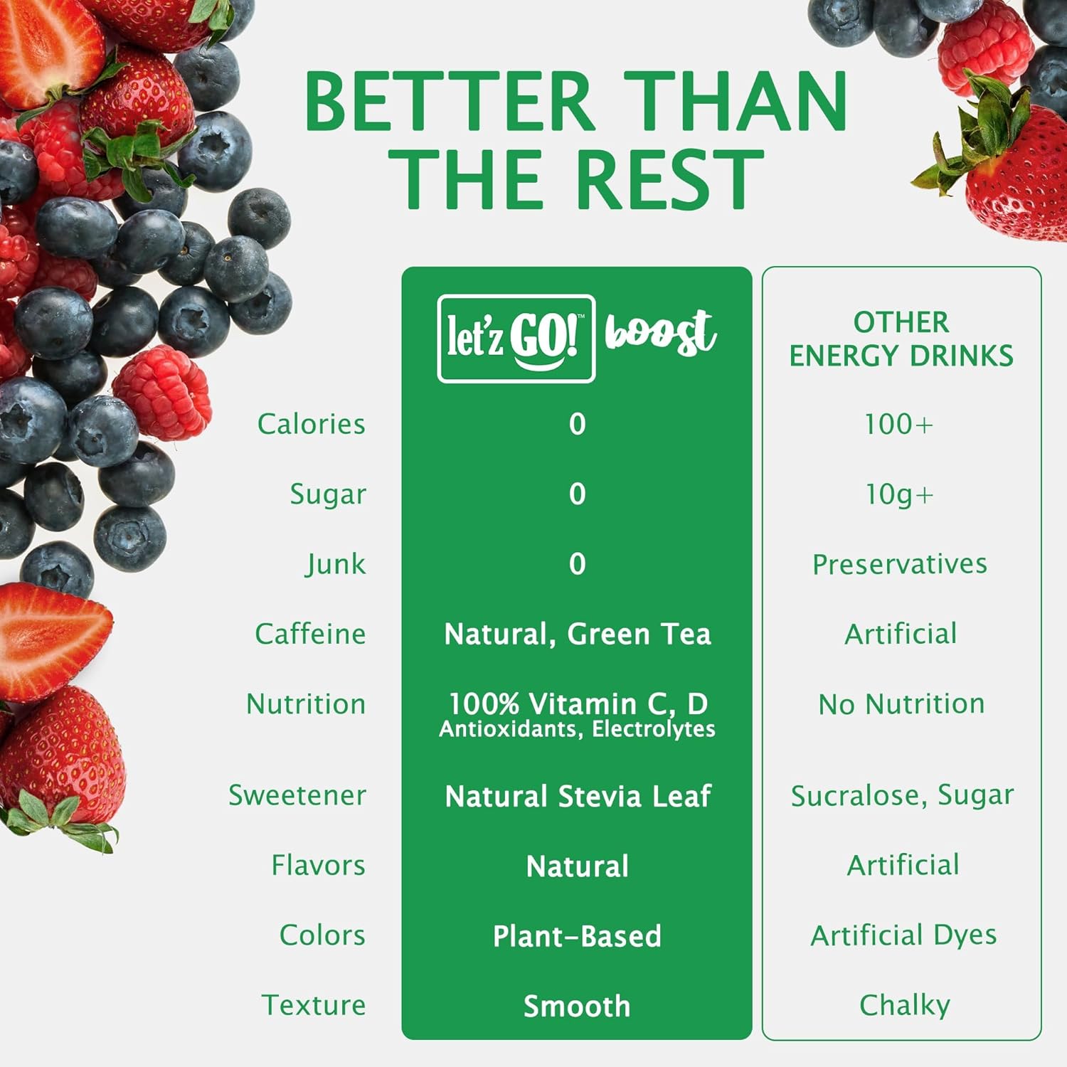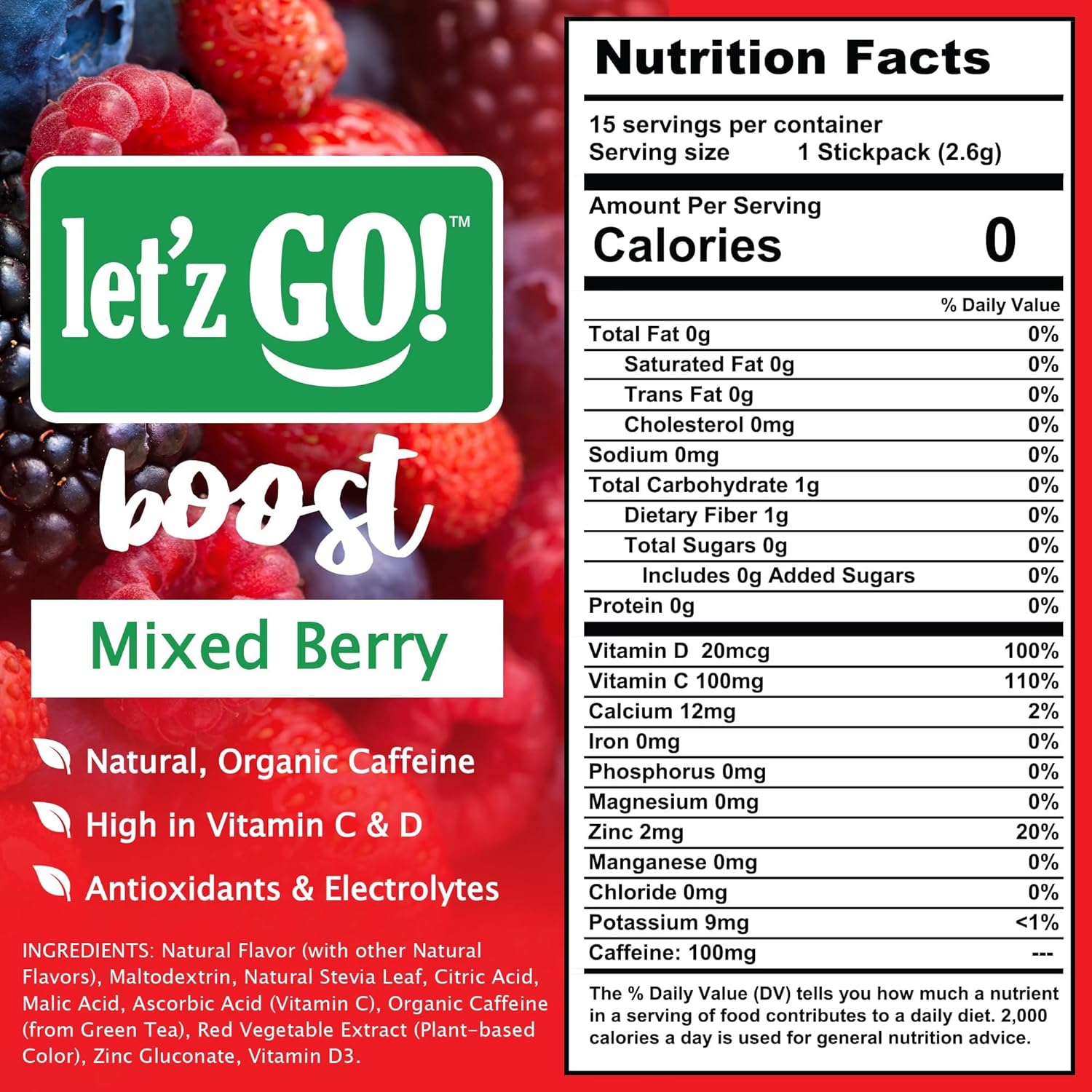 Let’z Go Clean Energy Drink Mix – Natural Caffeine Packets, Vitamins C + D, Electrolytes, Sugar-Free, Zero Calories | Anytime Energy | 15 Count (Mixed Berry)