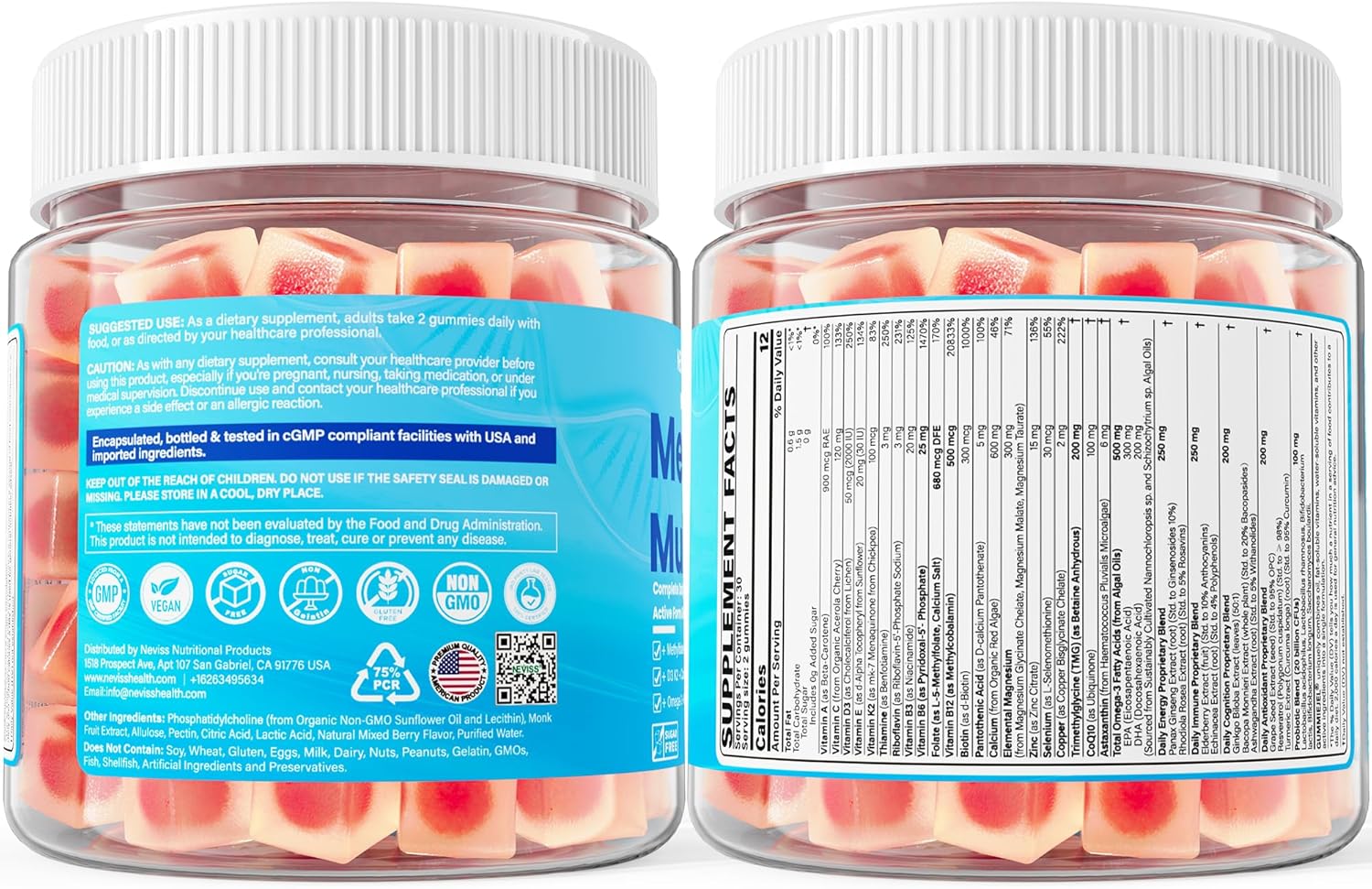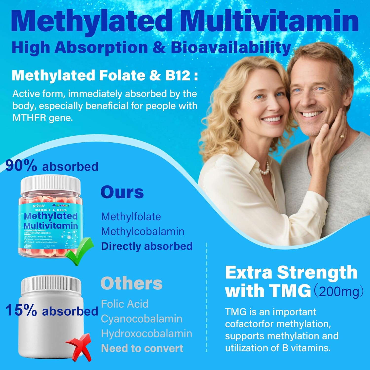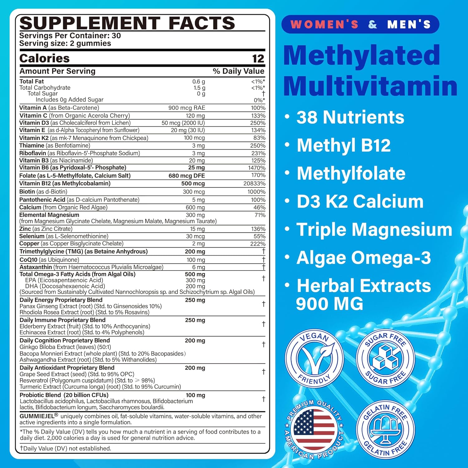 Methylated Multivitamin for Women & Men Gummies w/ Omega-3, Calcium, D3 K2, Methylfolate & B12, TMG, Daily Vitamin A, C, E, B Complex, Magnesium, CoQ10, Probiotic for Overall Health- Vegan, Sugar Free