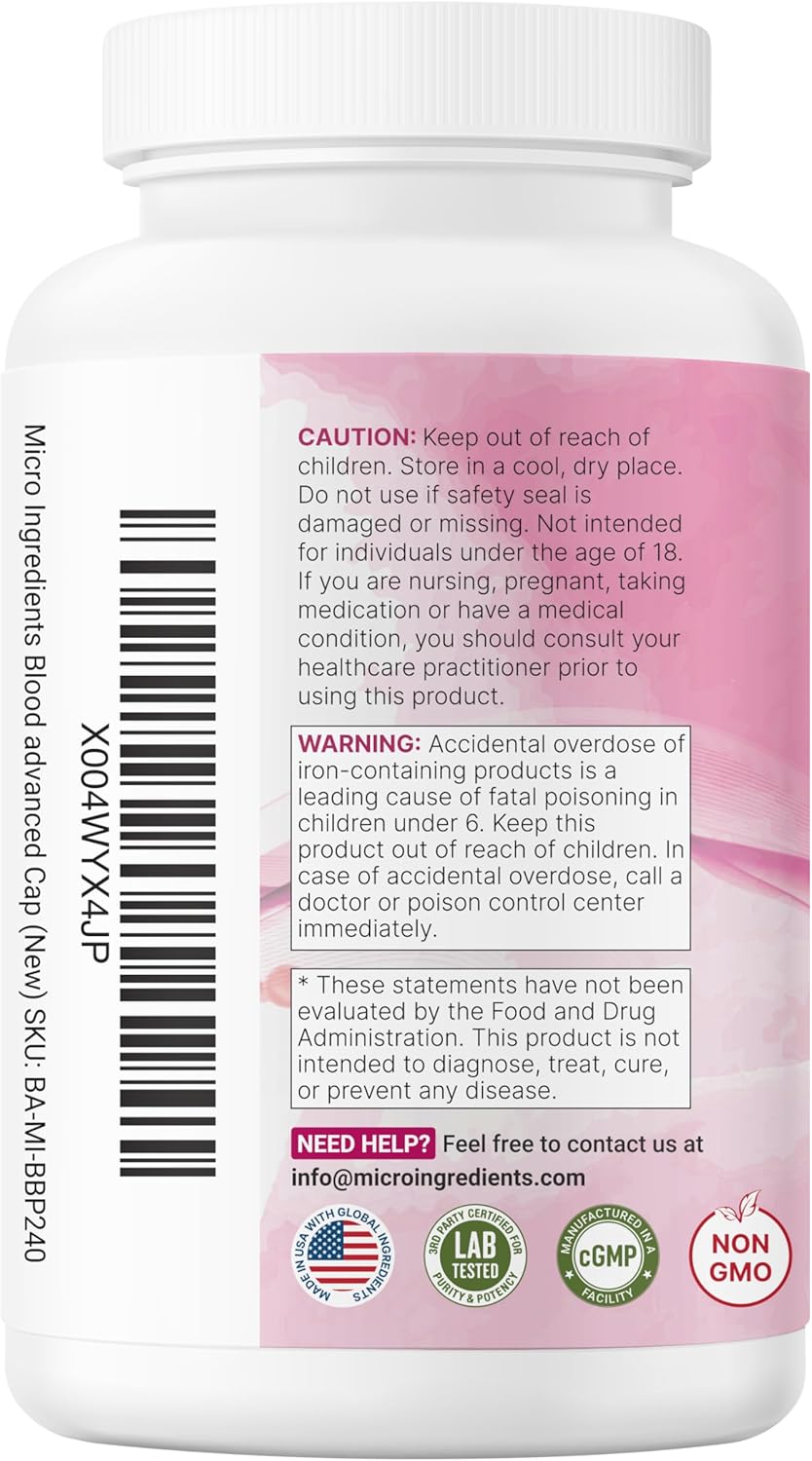 Micro Ingredients Blood+ Advanced Iron Supplement, 240 Veggie Capsules | 14-in-1 Iron Bisglycinate with Folate, Vitamins B, C | Chelated Iron Complex with Botanical Blend | Non-GMO