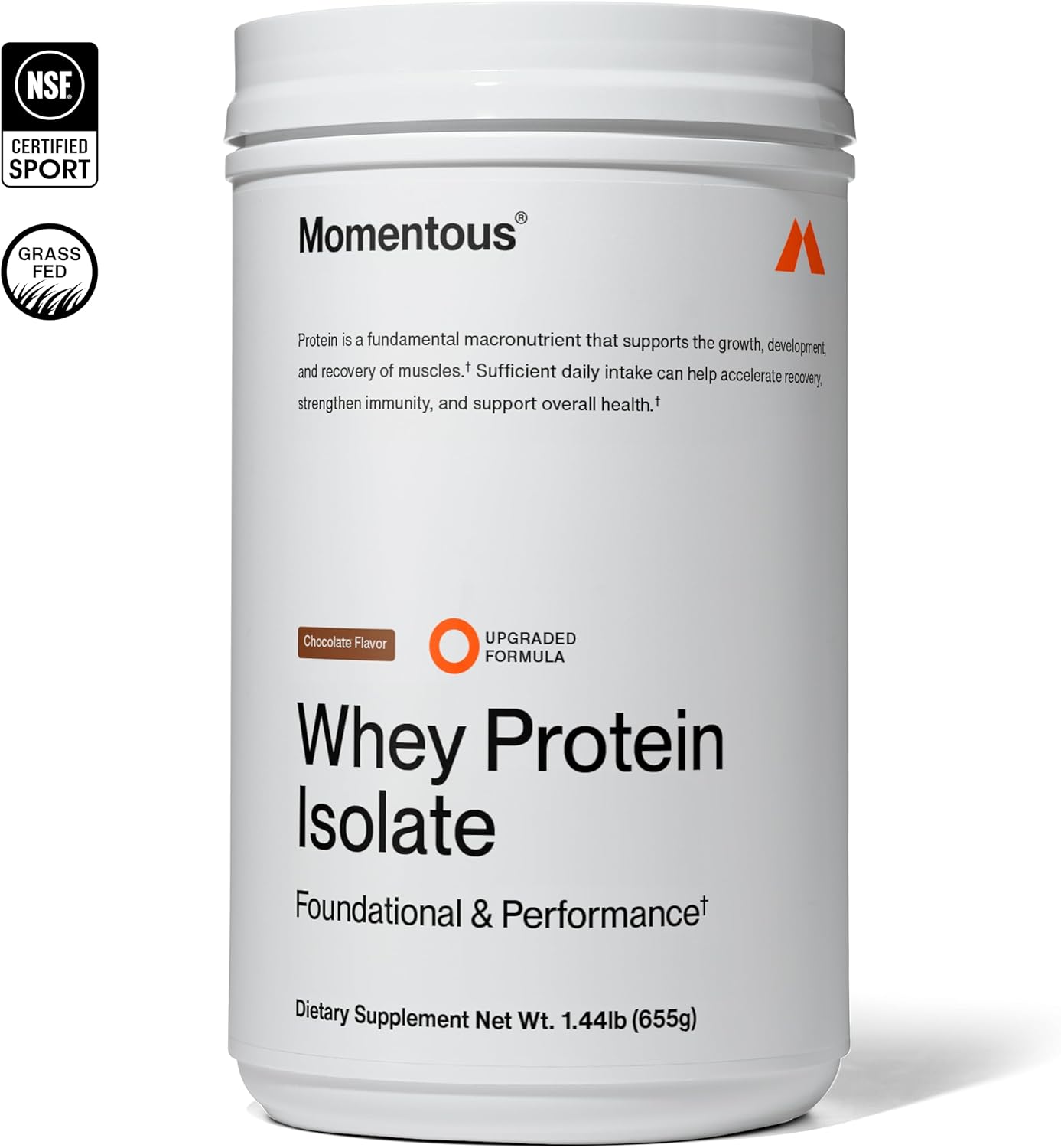 Momentous Essential Grass-Fed Whey Protein Powder – 20 g Whey Isolate Protein – NSF Certified for Sport – Gluten-Free – 25 Servings for Essential Everyday Use – Chocolate – Net WT 1.44 LB (655 g)