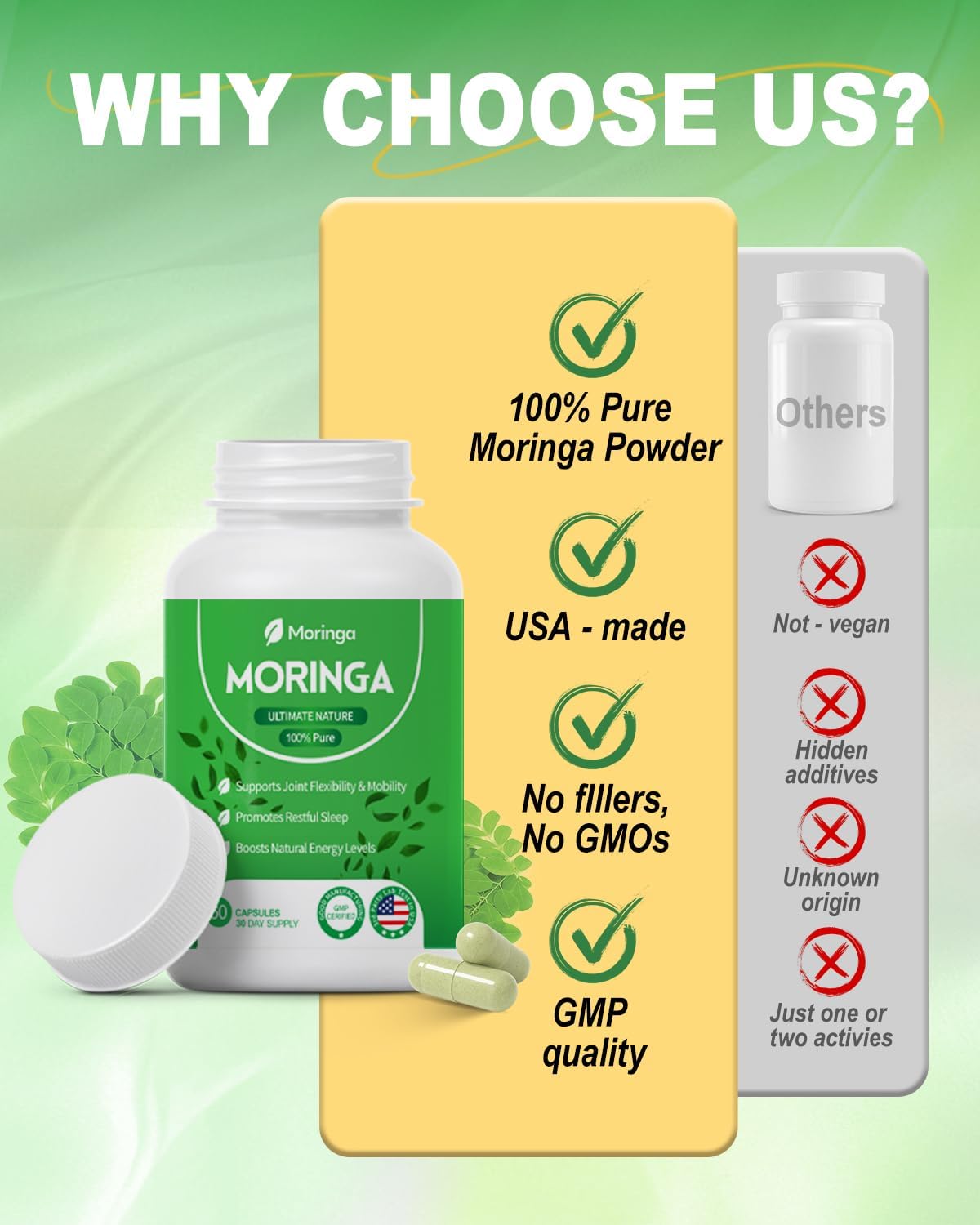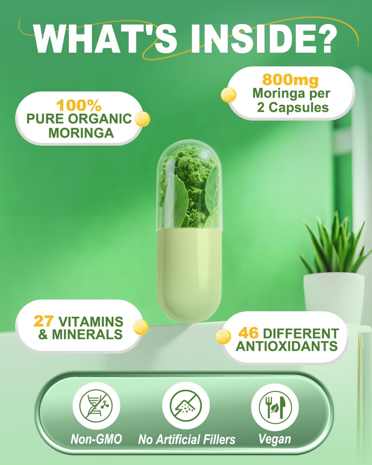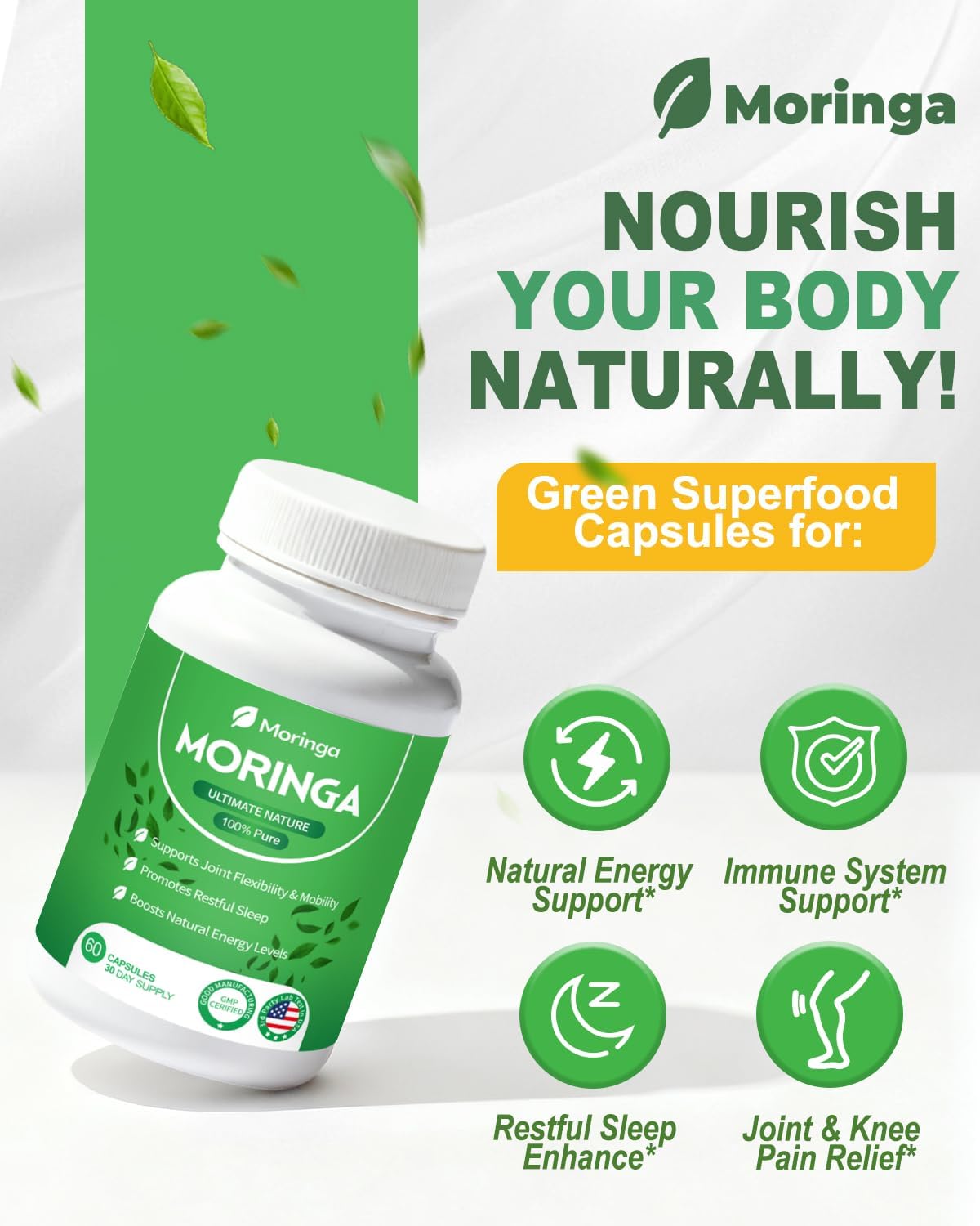 Moringa Capsules 800mg – Pure Moringa Powder Supplement for Energy, Immune, Skin & Gut Health – Caffeine-Free, Non-GMO Green Antioxidant Superfood 60 Vegan Capsules