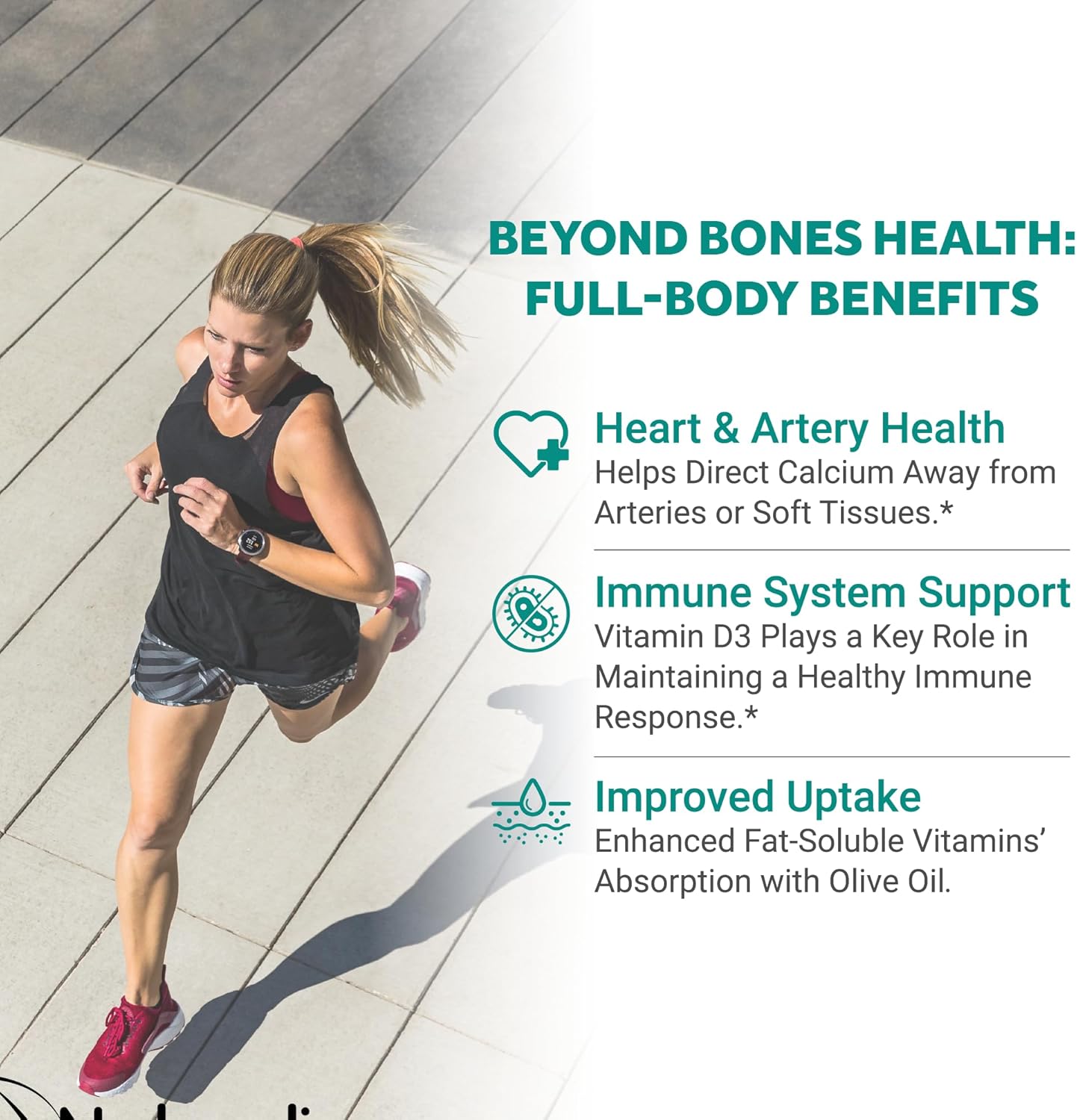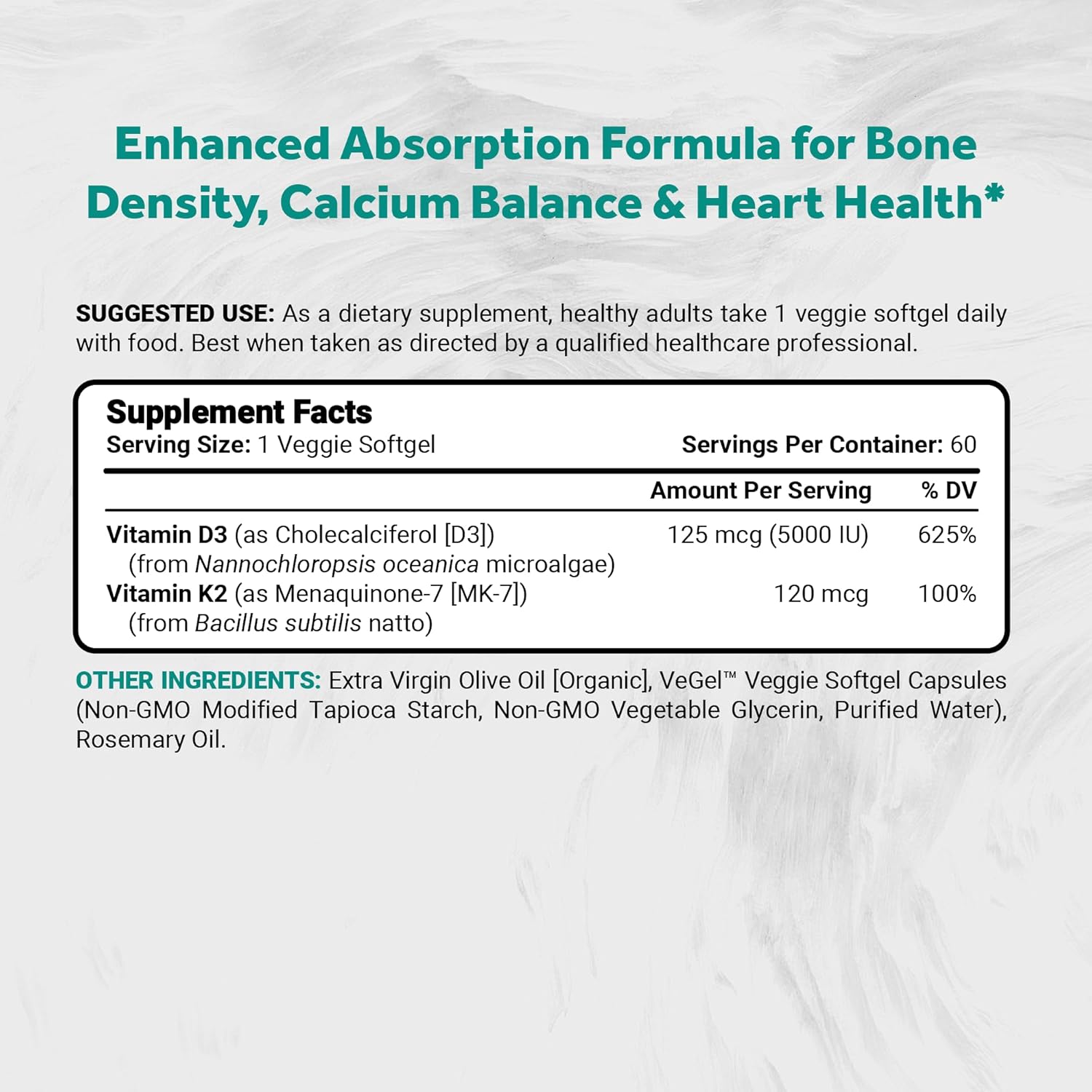 Naturalis Vegan Vitamin D3+K2 from Algae | 5000 IU D3 with 120mcg MK7 | Vegan Society Certified,Sustainably Sourced,Better Than Animal Derived | Better Support for Bone & Immune Health* | 60 Softgels