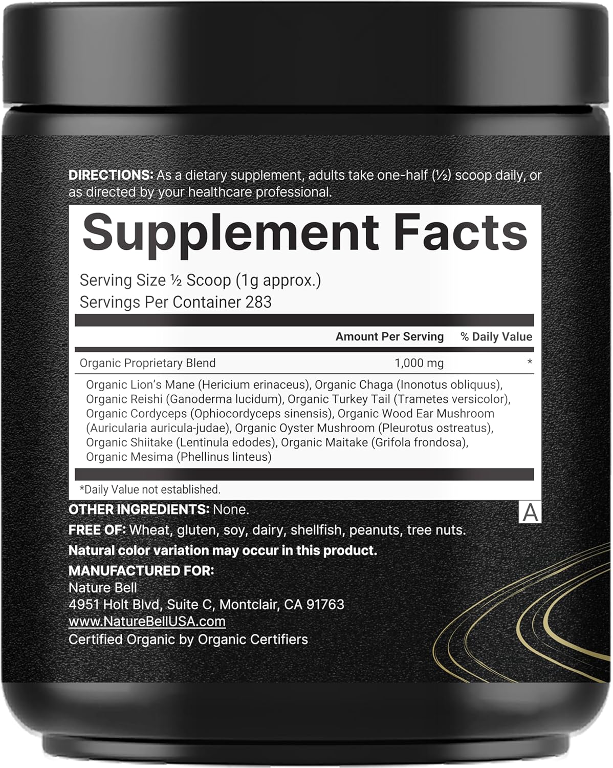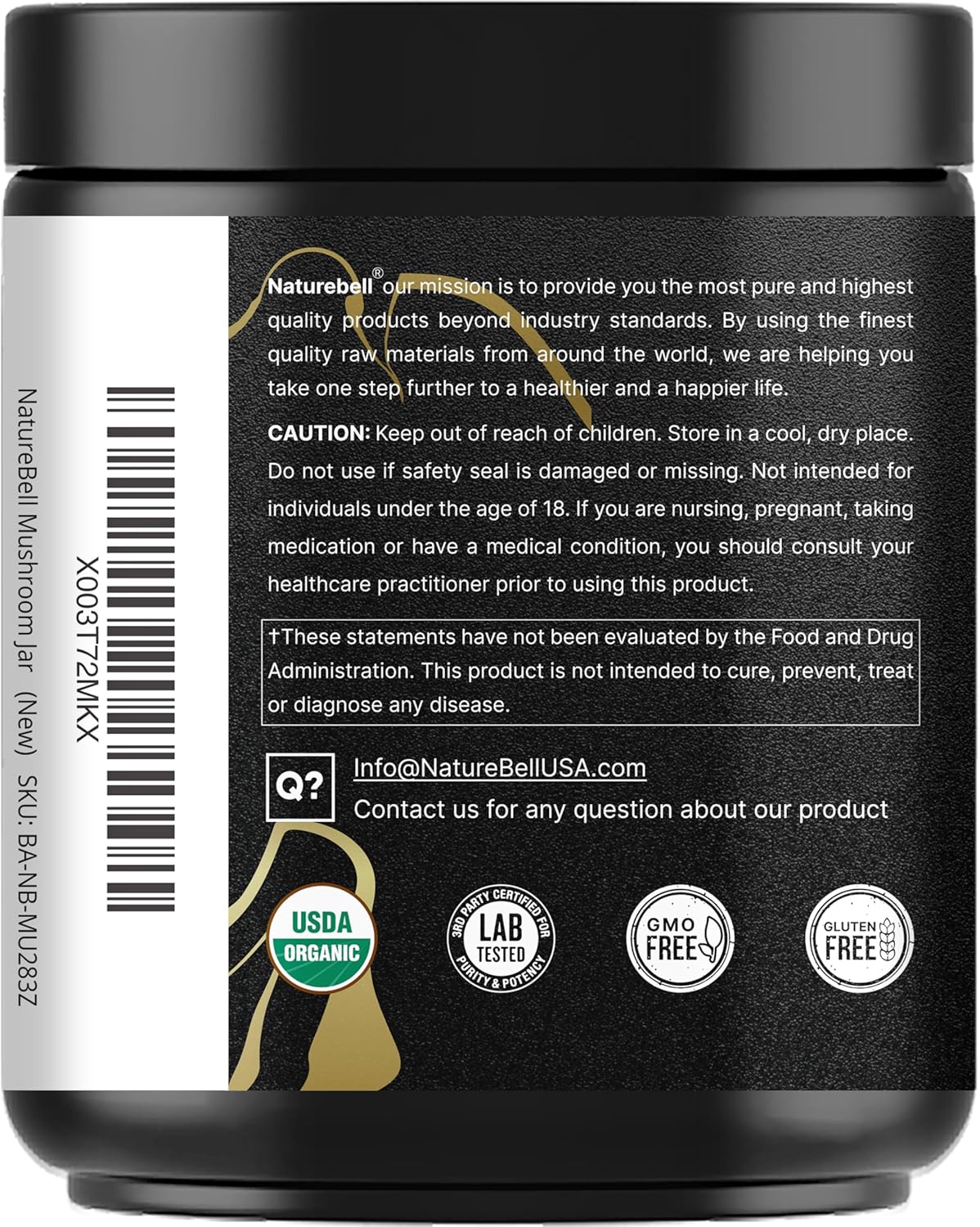 NatureBell Organic Mushroom Powder, 10oz | 10-in-1 Adaptogenic Blend with Lion’s Mane, Reishi, Shiitake, Chaga & More | Great for Coffee, Smoothies & Recipes