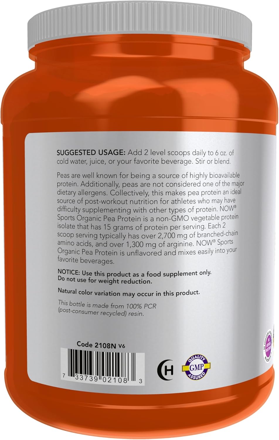 NOW Foods Sports Nutrition, Certified Organic Pea Protein 15 Grams, Unflavored Powder, 1.5-Pound
