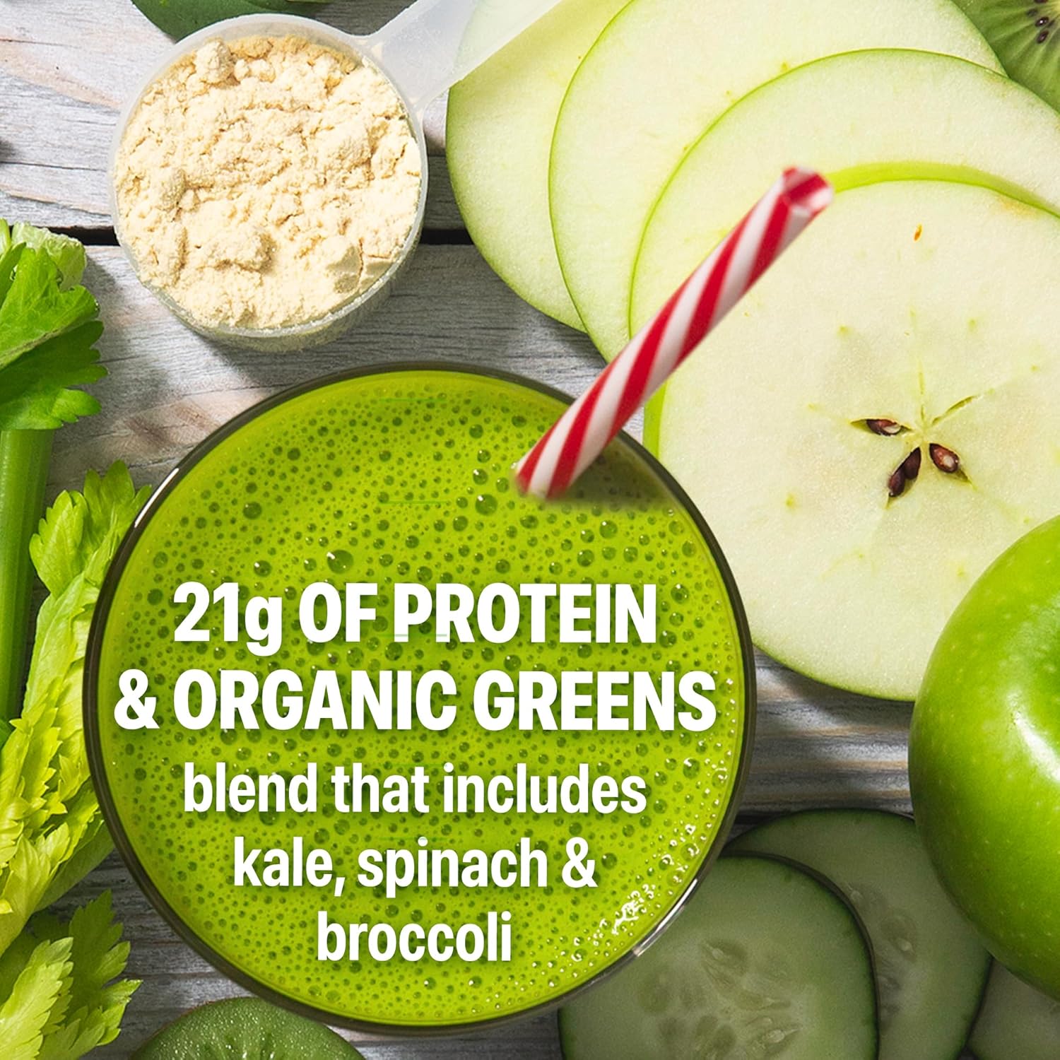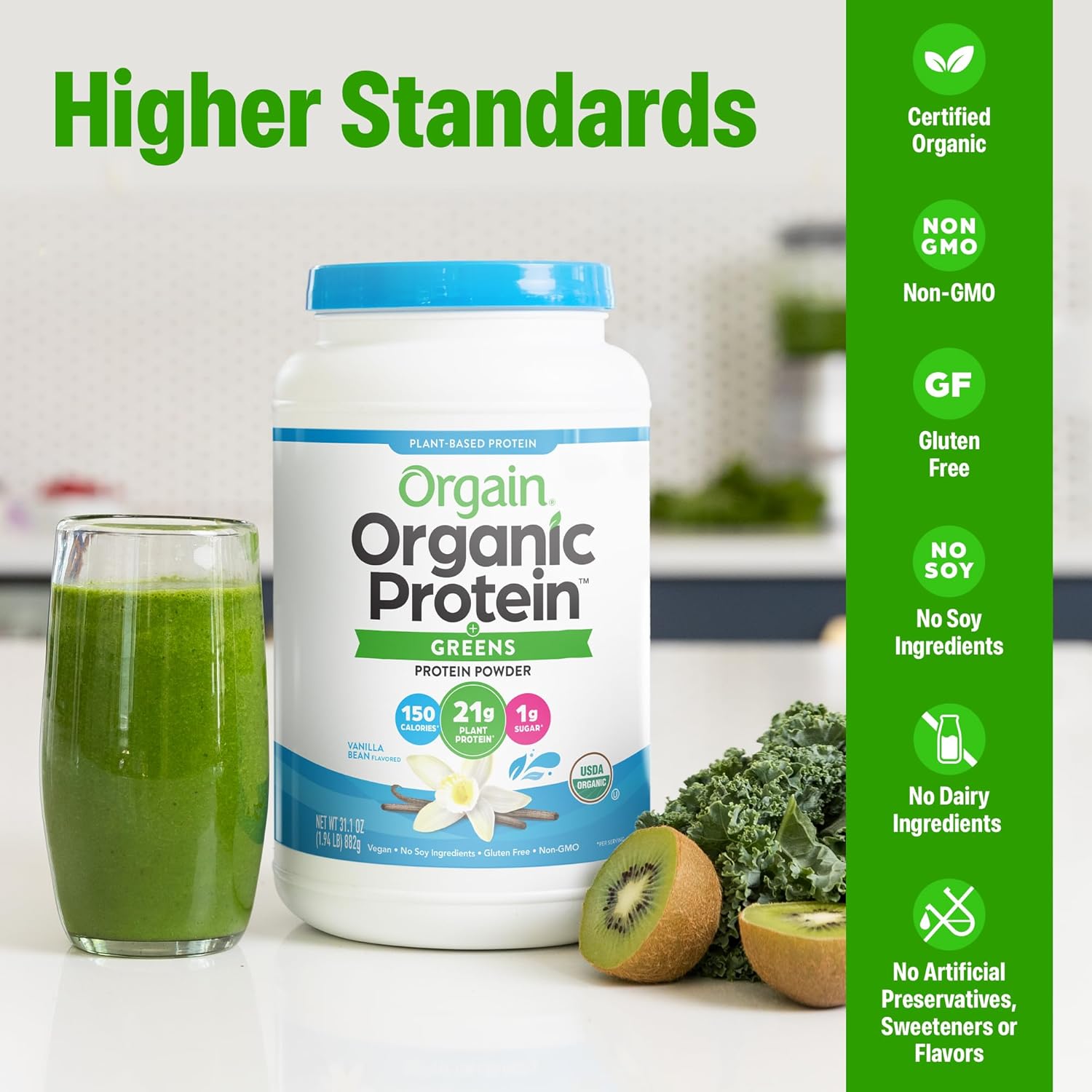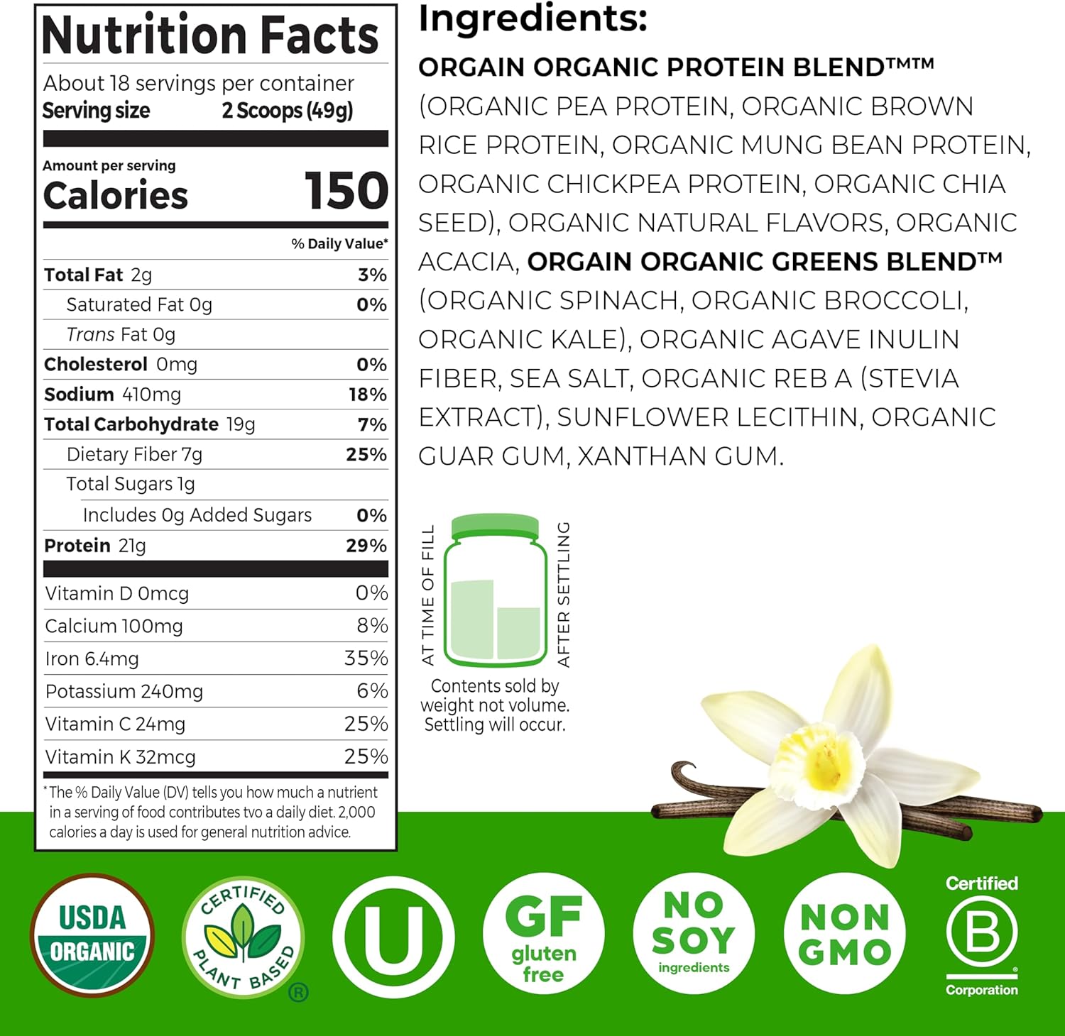 Orgain Organic Vegan Protein Powder + Greens, Vanilla Bean – 21g Plant Based Protein, Gluten Free, Dairy Free, Lactose Free, Soy Free, No Sugar Added, With Iron & Prebiotics for Gut Health – 1.94lb