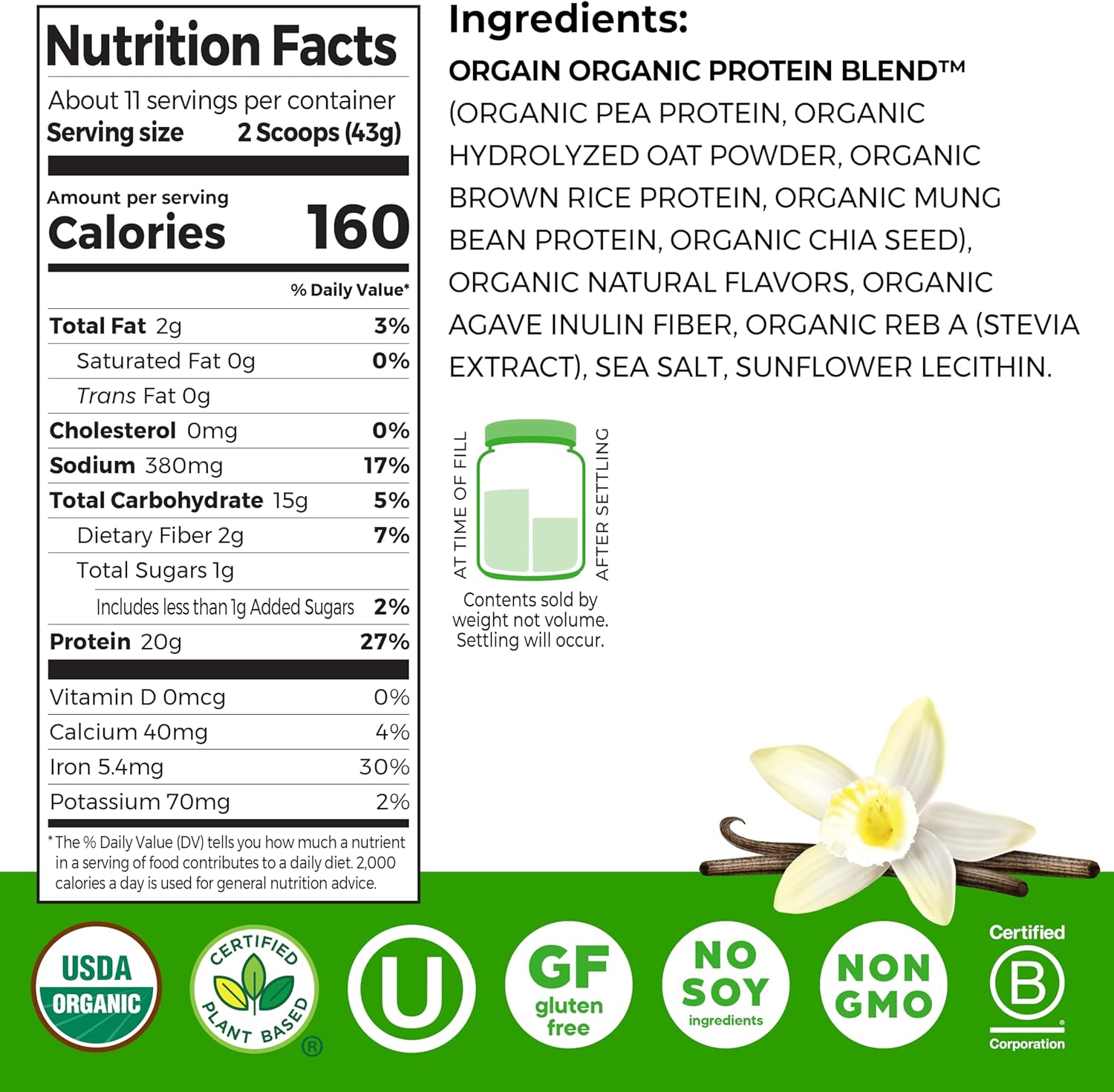 Orgain Organic Vegan Protein Powder + Oat Milk, Vanilla Bean – 20g Plant Based Protein, Gluten Free, No Dairy, Soy or Lactose Ingredients, Low Sugar, Non-GMO, Kosher, For Shakes & Smoothies – 1.05lb