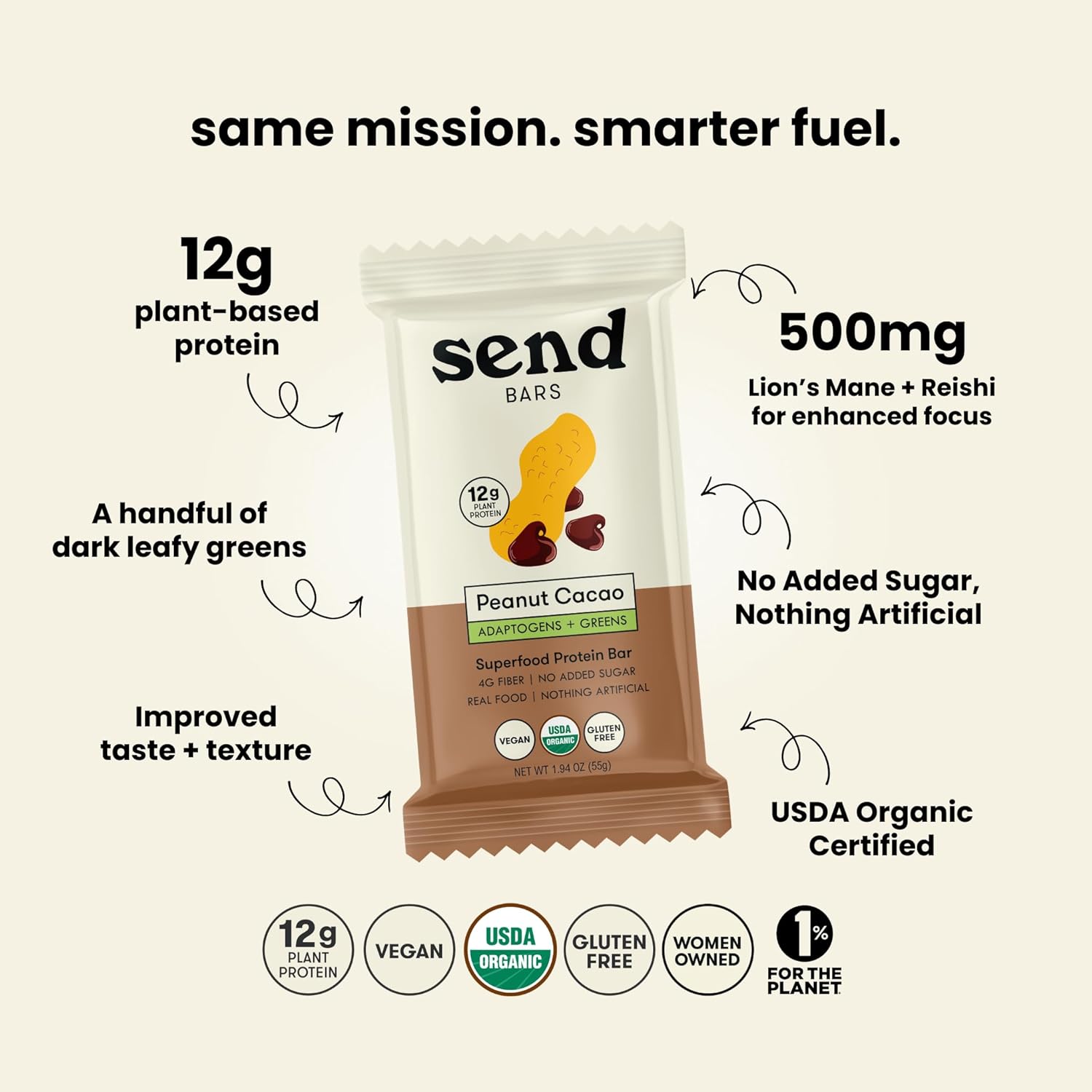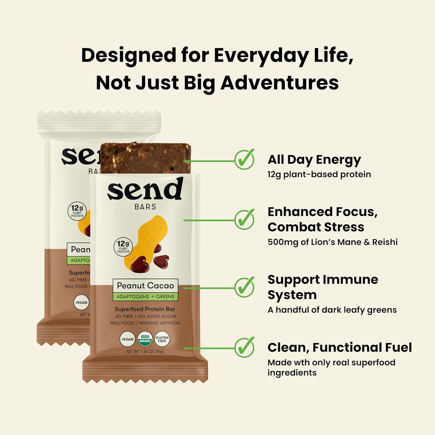 SEND Bars Organic Plant Based, Vegan, Healthy Protein Bars with Greens (Organic Peanut Cacao, 8 Bars) – Only Real Food Ingredients, No Added Sugar, Gluten Free, Dairy Free, Non-GMO, Healthy Snacks
