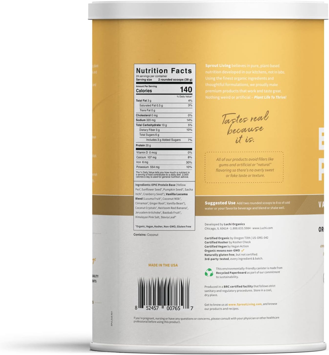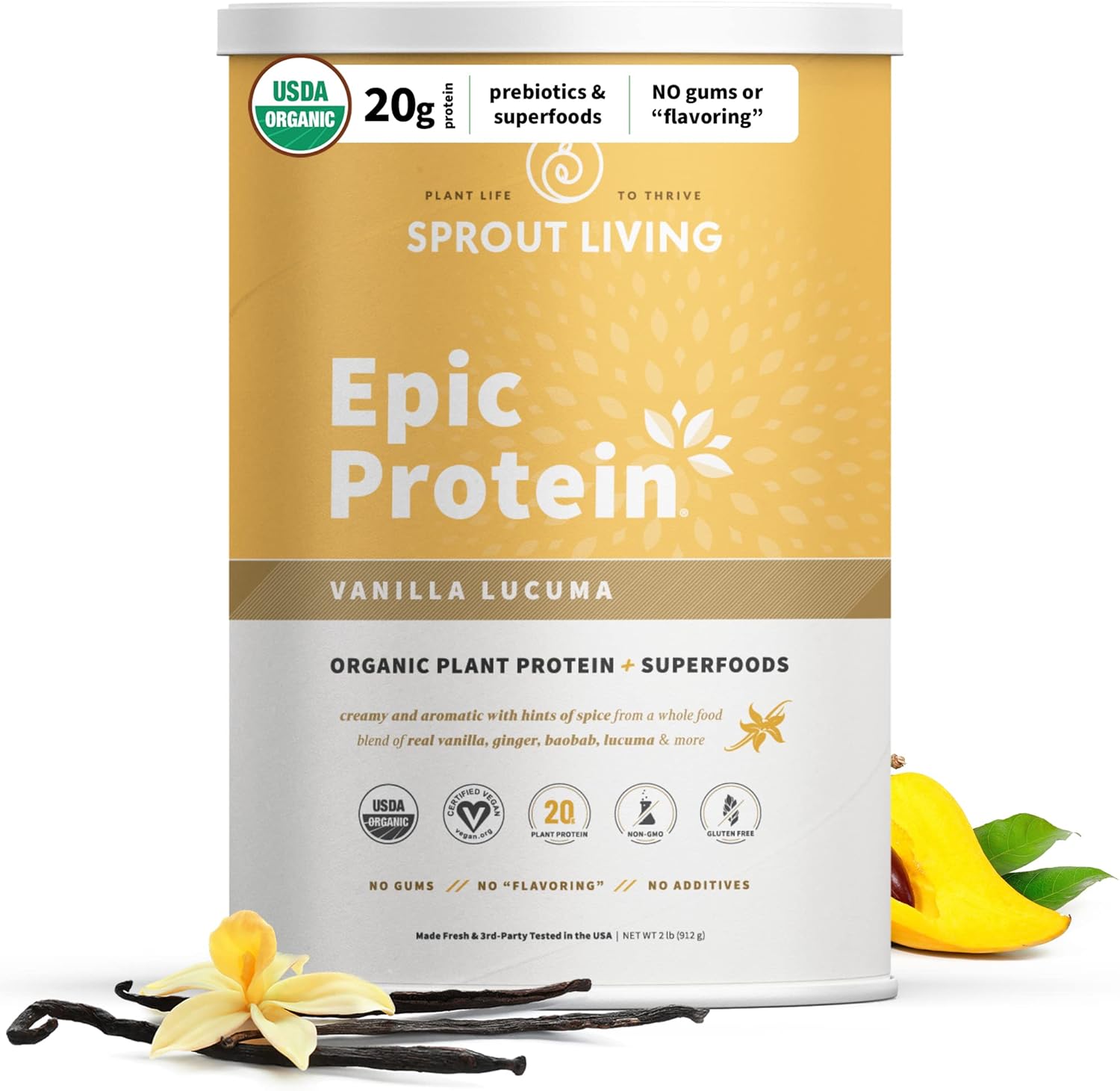 Sprout Living Epic Protein, Plant Based Protein & Superfoods Powder, Vanilla Lucuma Powder | 20 Grams Organic Protein Powder, Vegan, Non Dairy, Non-GMO, Gluten Free, Low Sugar (2 Pound, 24 Servings)