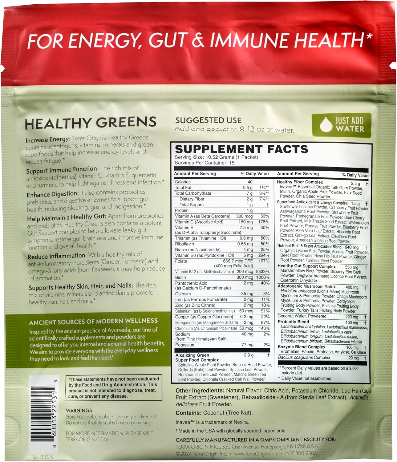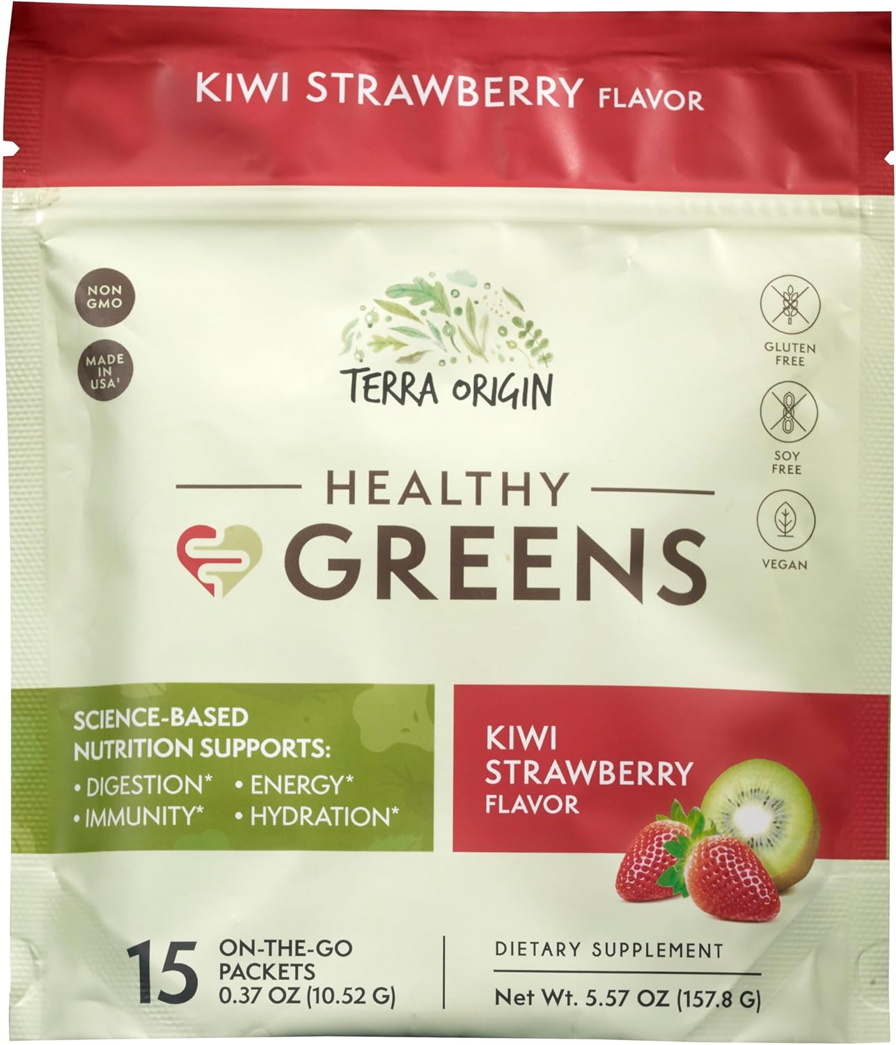 TERRA ORIGIN Greens Powder Packets | 74+ Vitamin and Superfoods | Supports Gut Health, Bloating, and Energy | with Antioxidant, Digestive Enzymes, Adaptogens | Kiwi Strawberry (15 Packets)