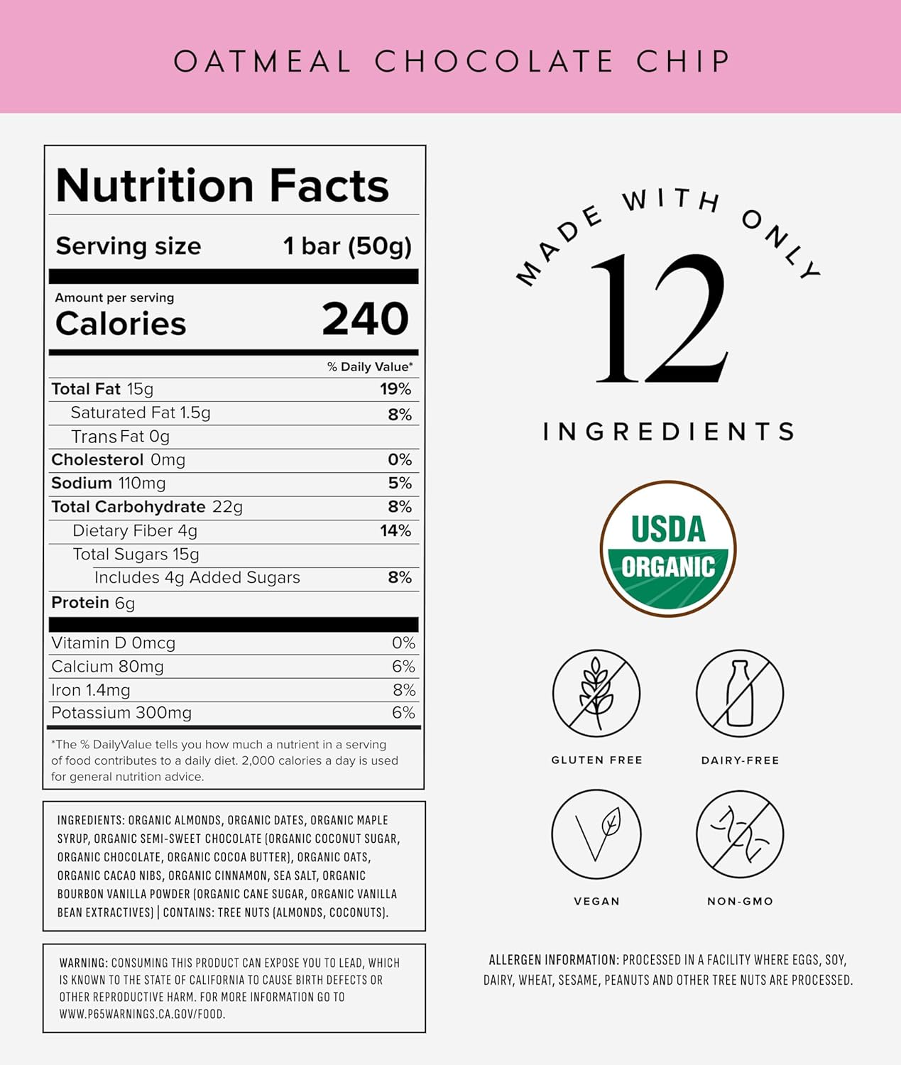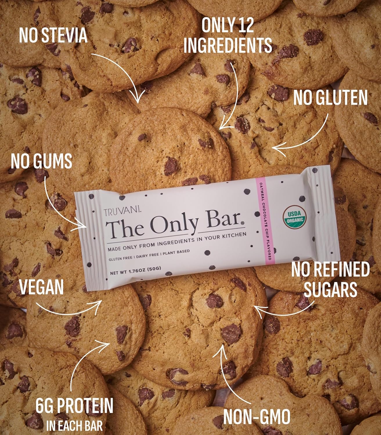 Truvani Plant Based Snack Bars | Oatmeal Chocolate Chip 1 Pack | 6g Protein | USDA Organic and Vegan | The Only Bar | Dairy, Soy, and Gluten Free | Individually Wrapped