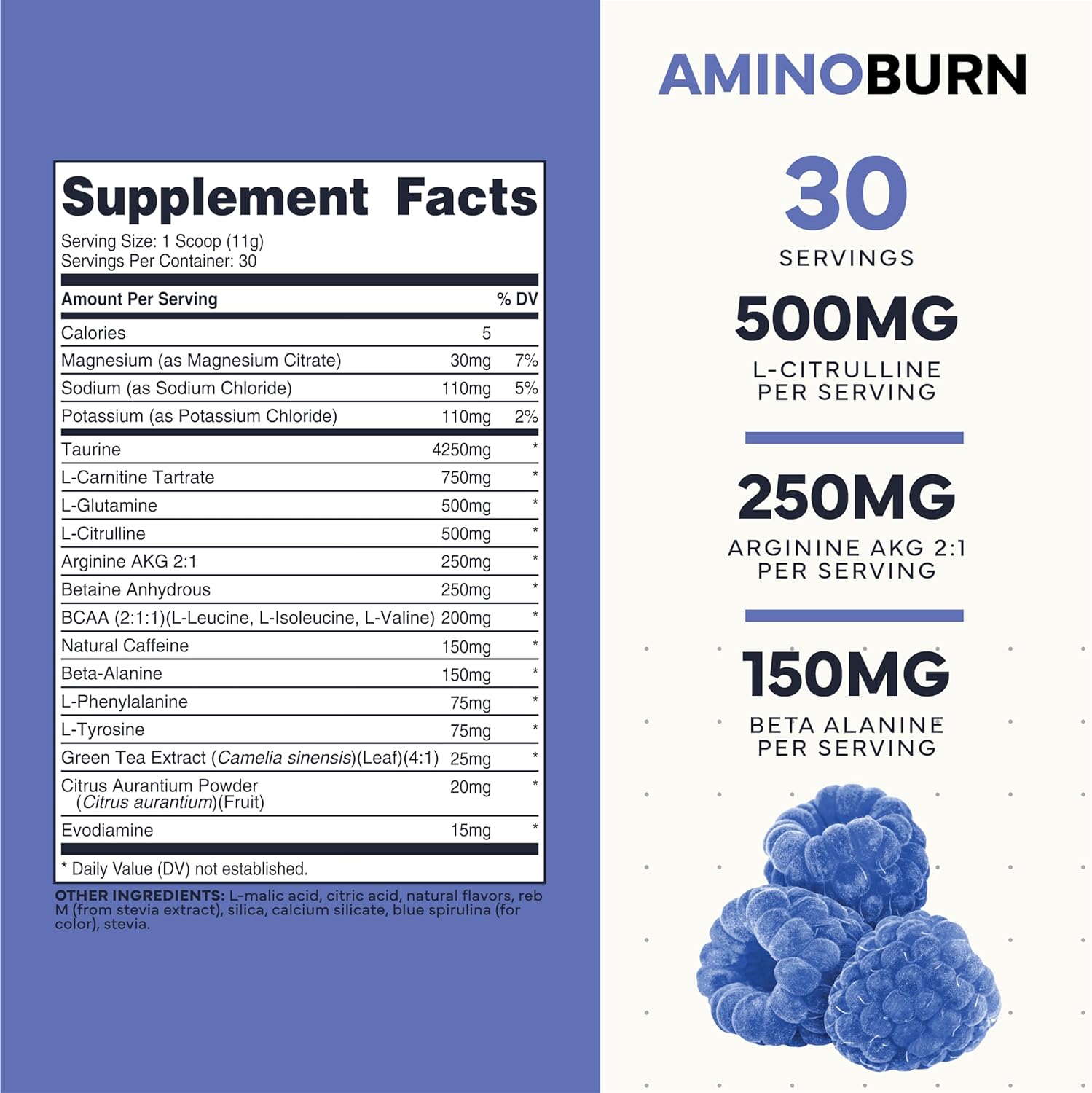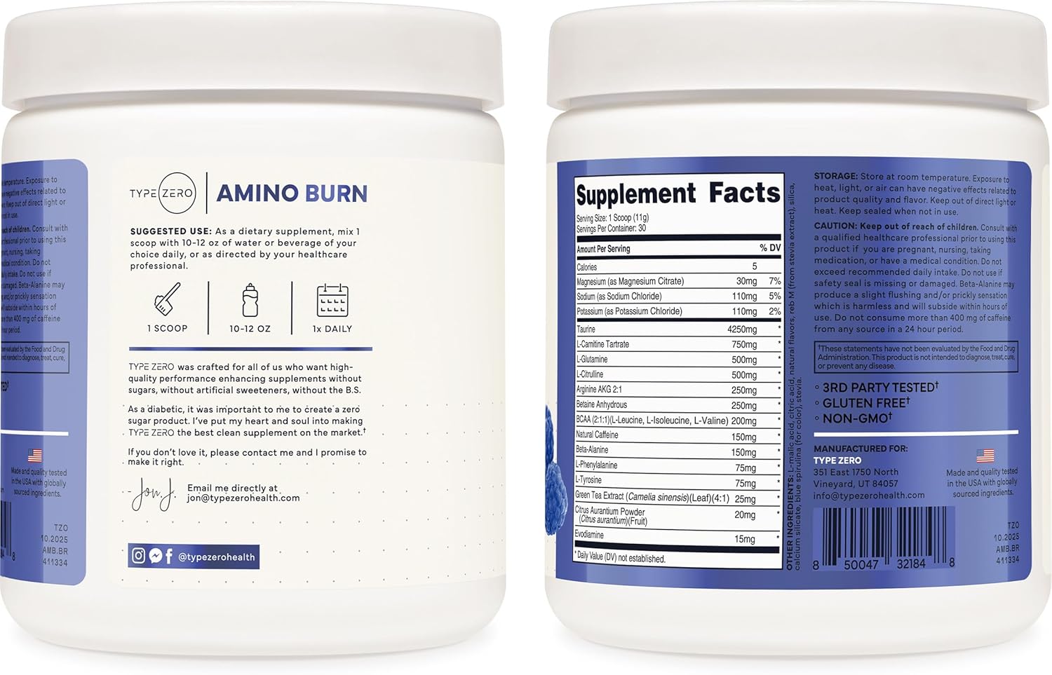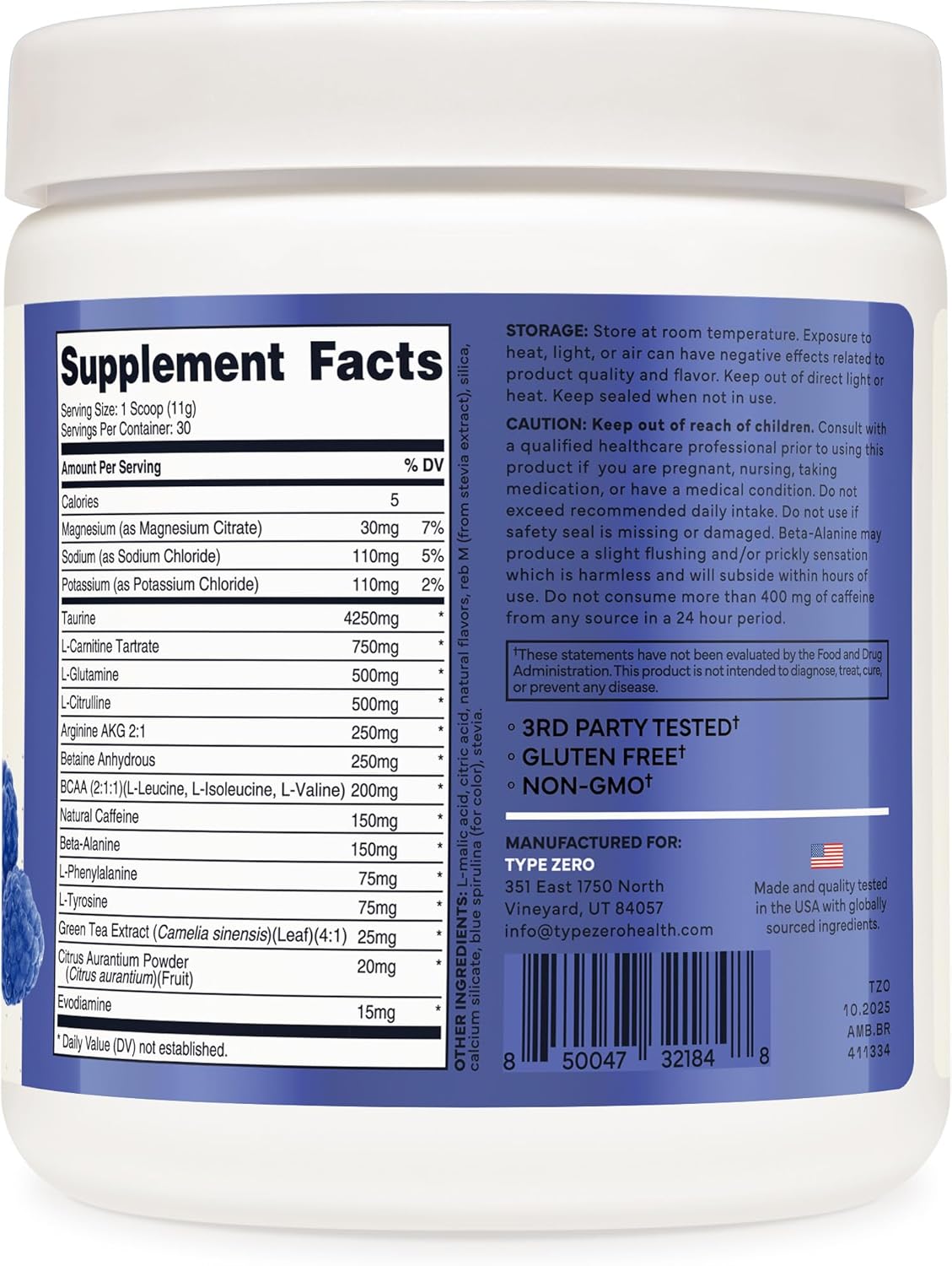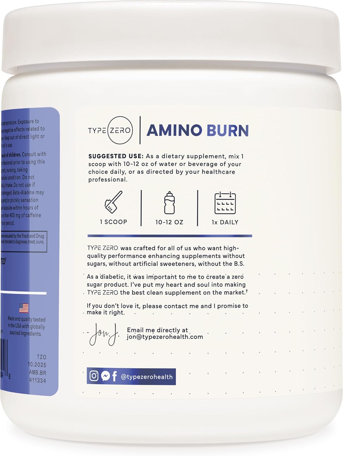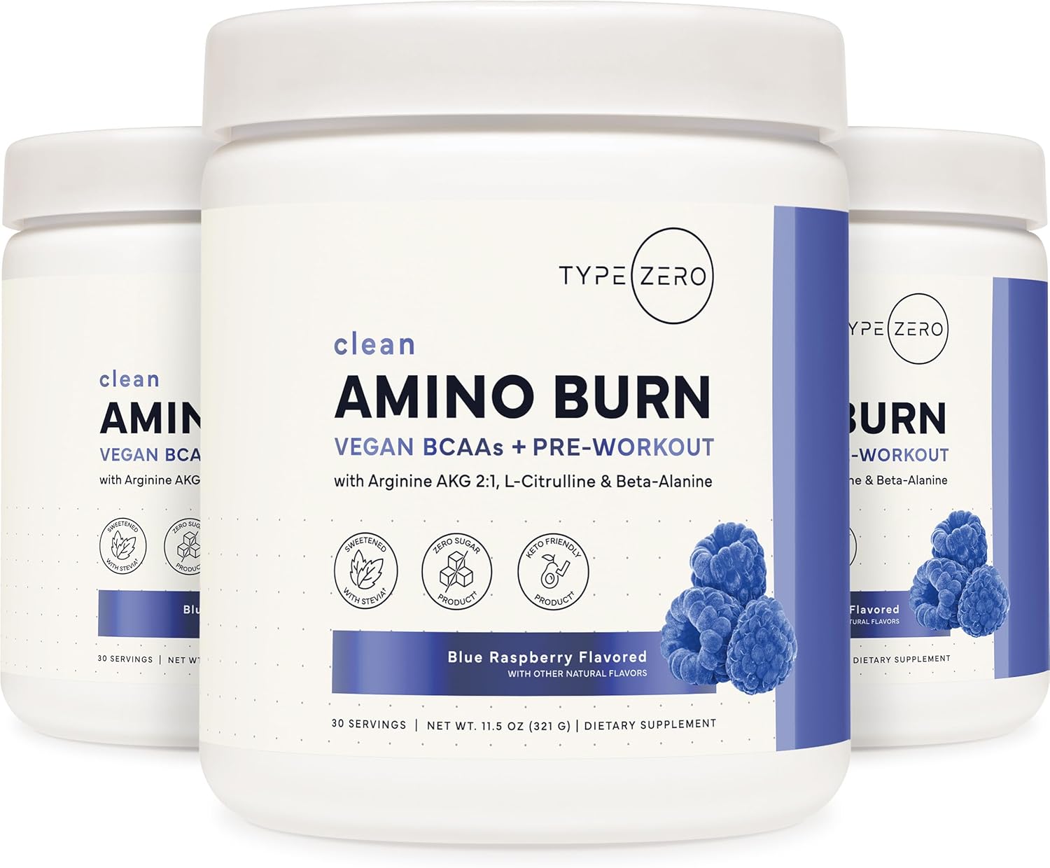 Type Zero Amino Burn – Vegan BCAA + Clean Pre Workout Powder with Arginine AKG, L-Citrulline & Beta Alanine – Amino Acid Clean Energy, Endurance & Hydration Supplement – Blue Raspberry, 30 Servings