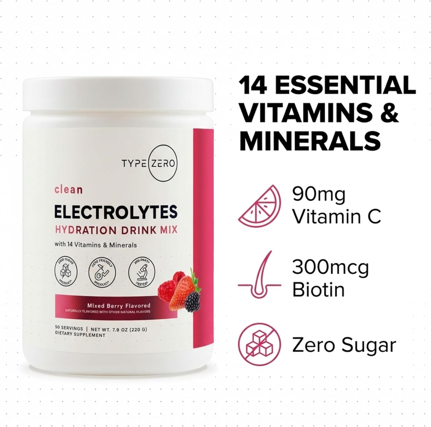 Type Zero Clean Electrolytes Hydration Powder Drink Mix + 14 Essential Vitamins & Minerals – Sugar Free, Zero Artificial Ingredients – Mixed Berry Flavor, 50 Servings