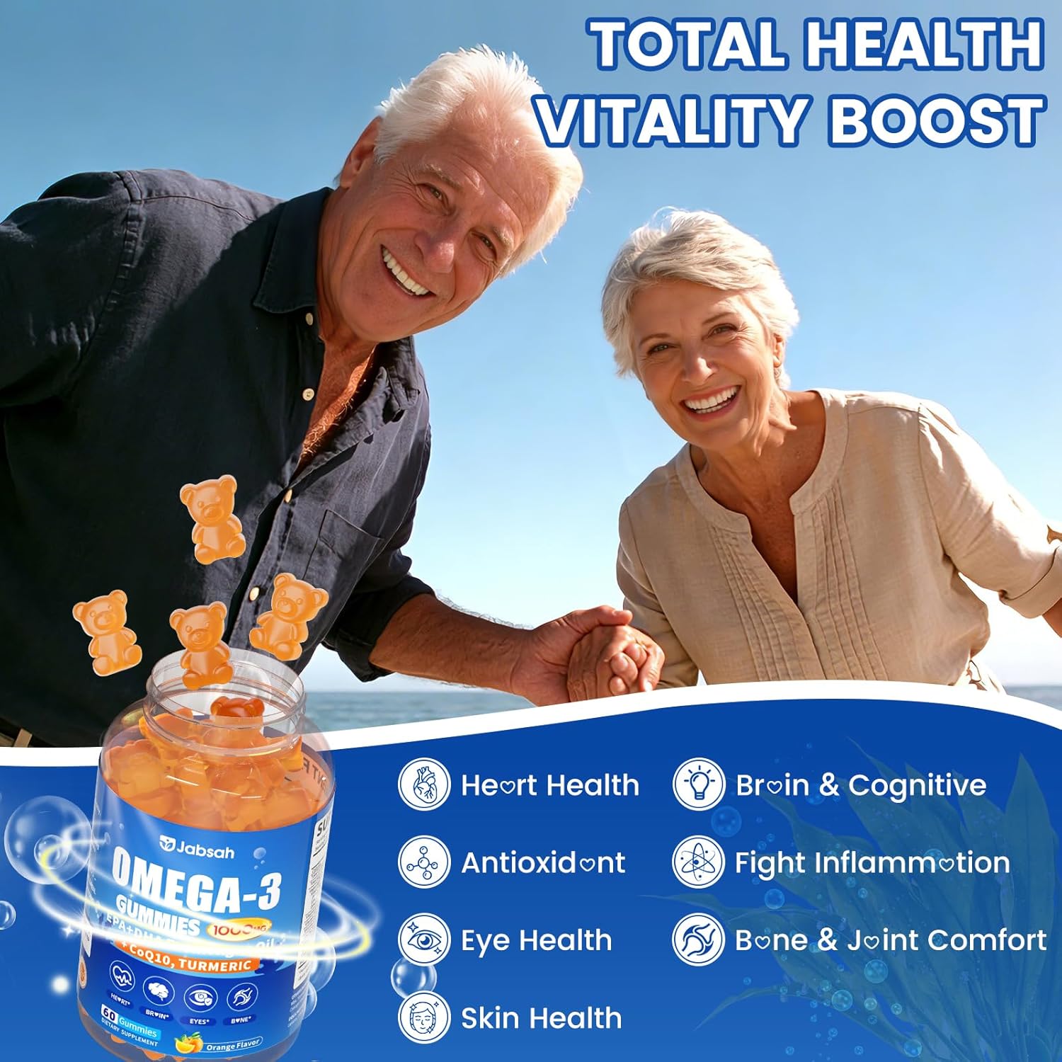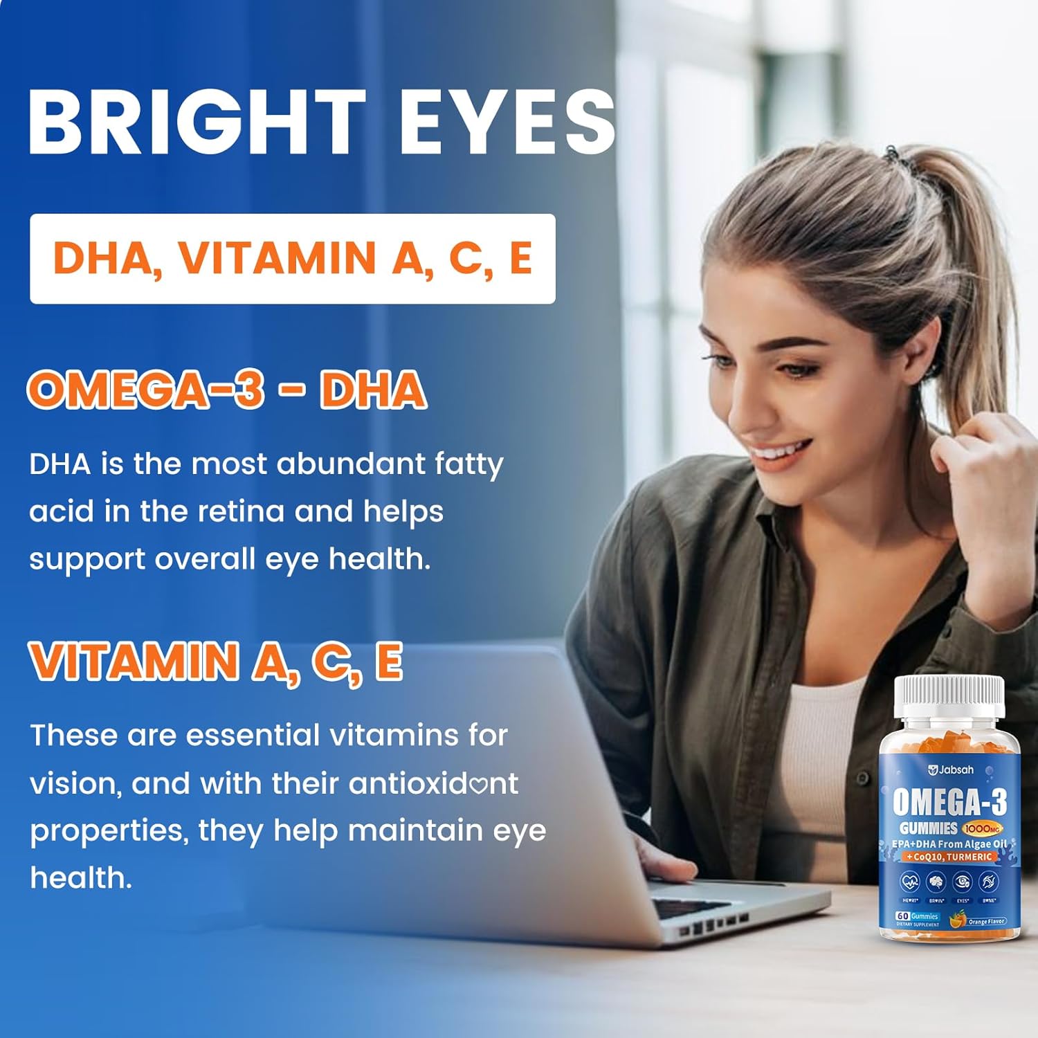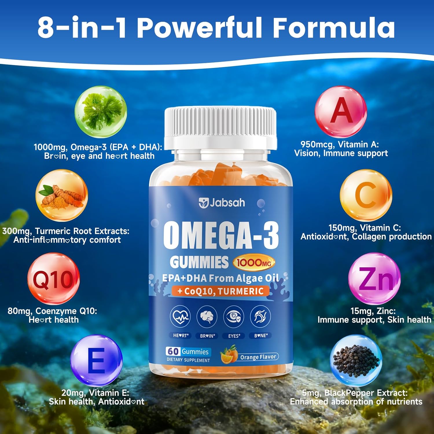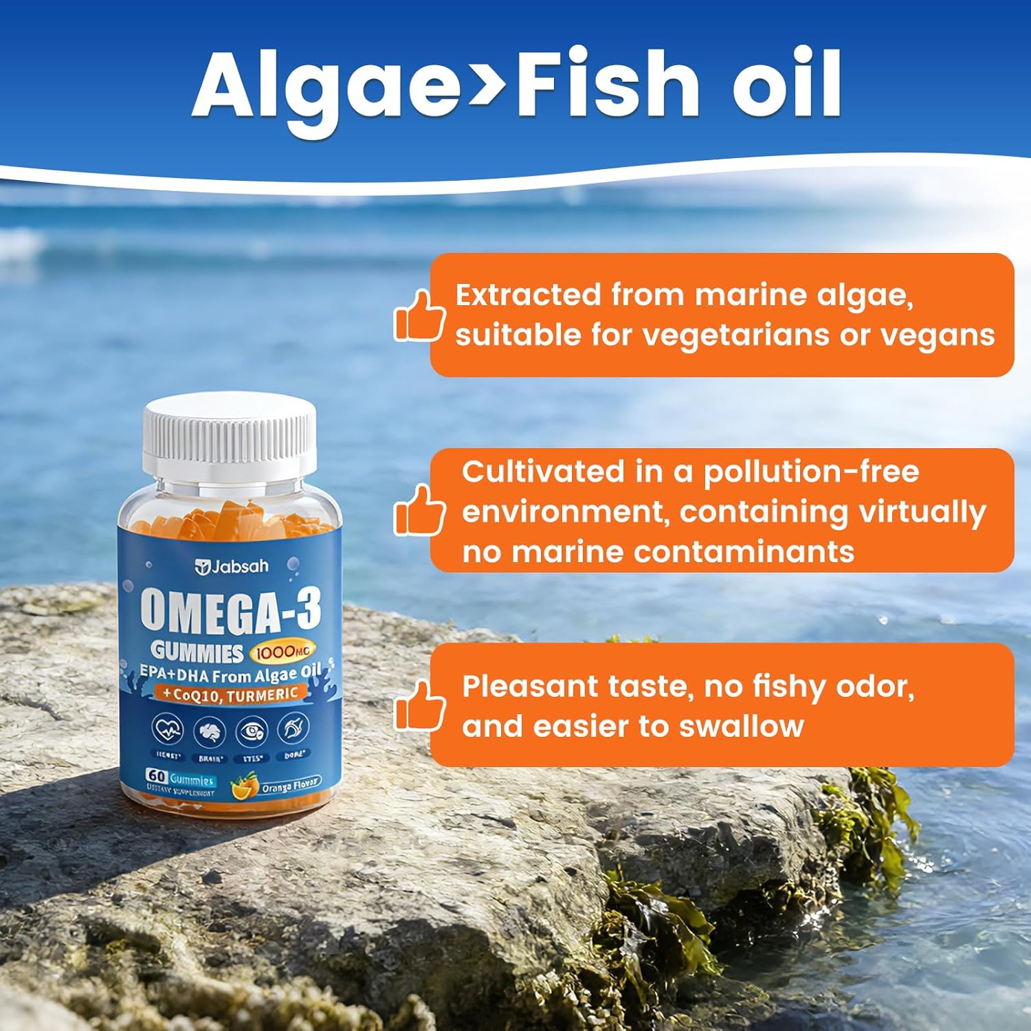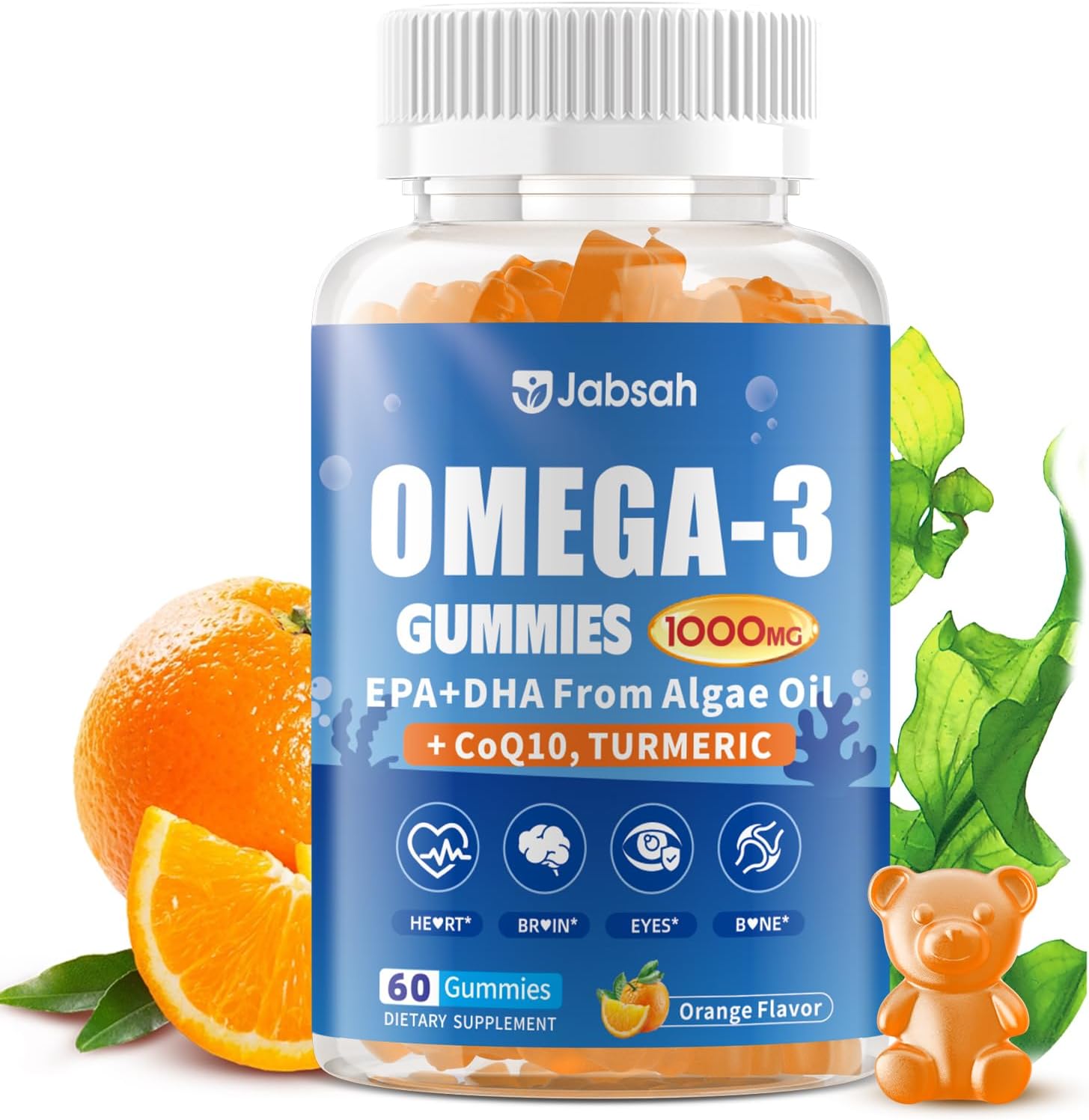 Vegan Omega-3 Gummies 1000mg from Algae Oil (DHA 460mg & EPA 230mg), Omega 3 Fish Oil Alternative for Adults, Plus Turmeric & CoQ10 for Brain, Eye & Immune Health, No Fishy Taste, Sugar Free, 60 Cts