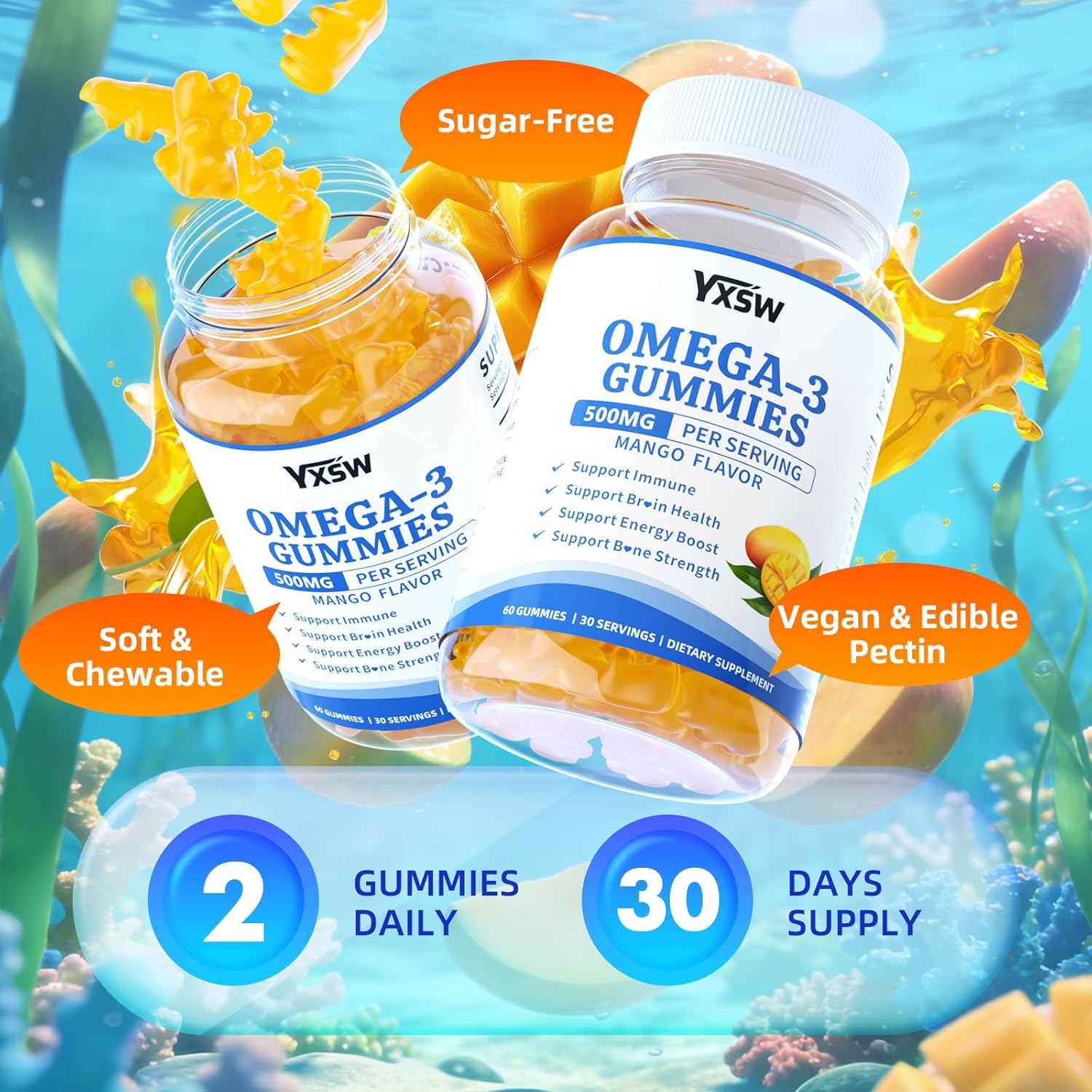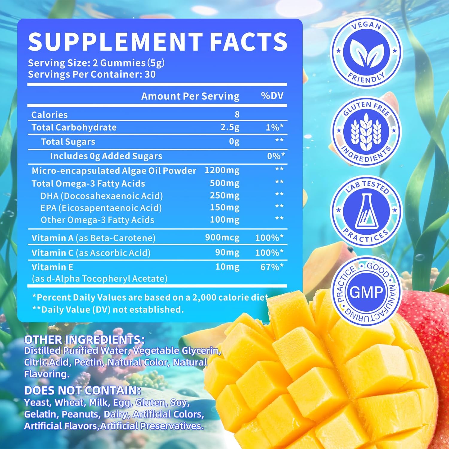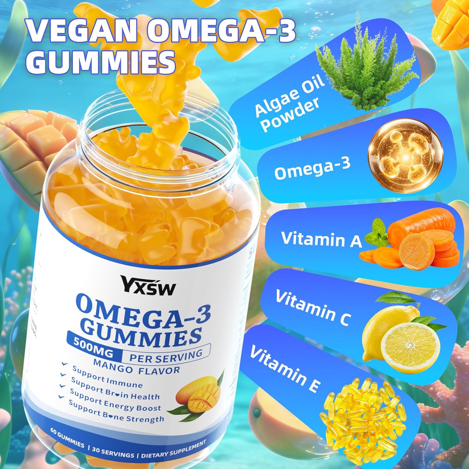 Vegan Omega-3 Gummies 500mg, Omega 3 Fish Oil Alternative for Adults with Plant-Based EPA & DHA & Vitamin A, C, E for Brain, Eye & Immune Health, Sugar Free, Mango Flavor, 60 Count