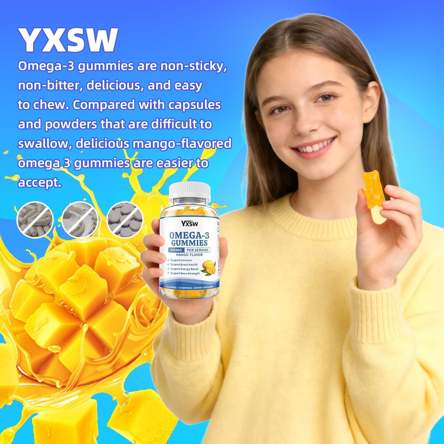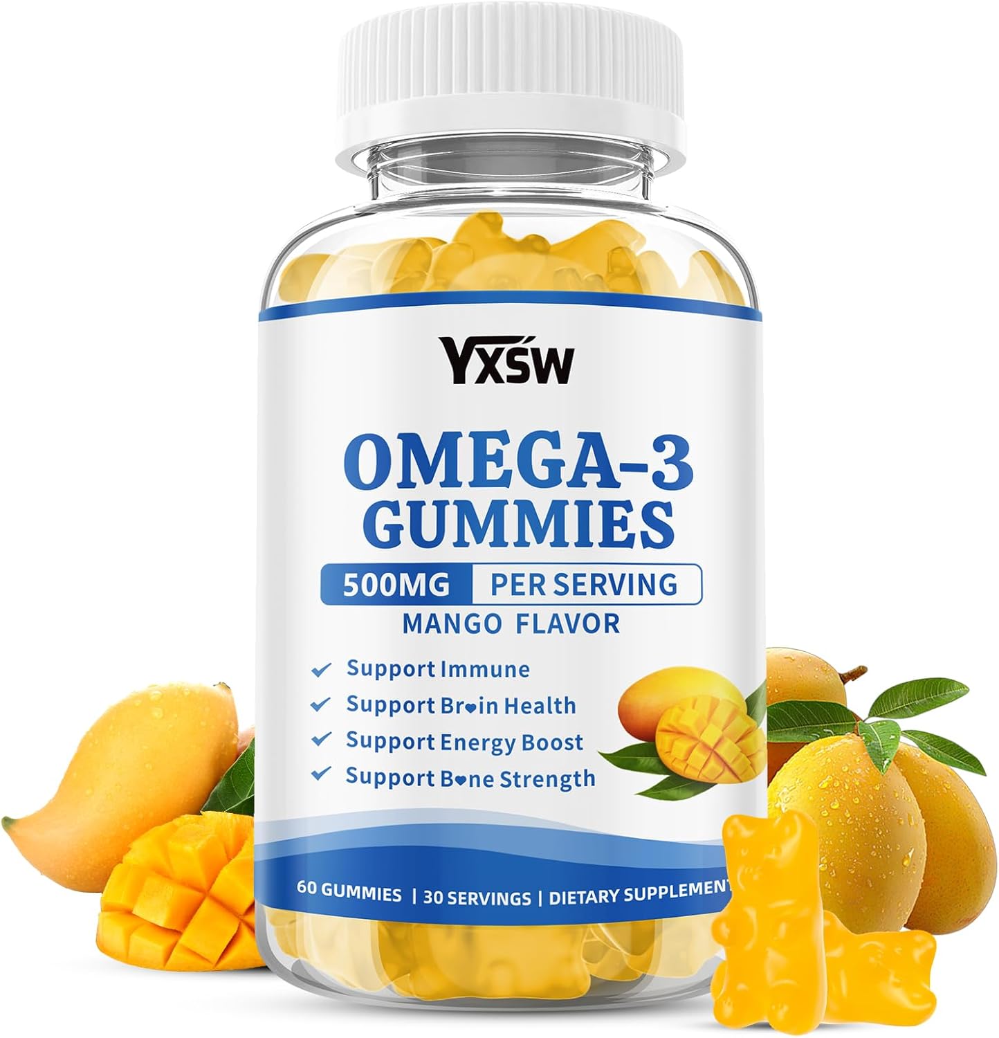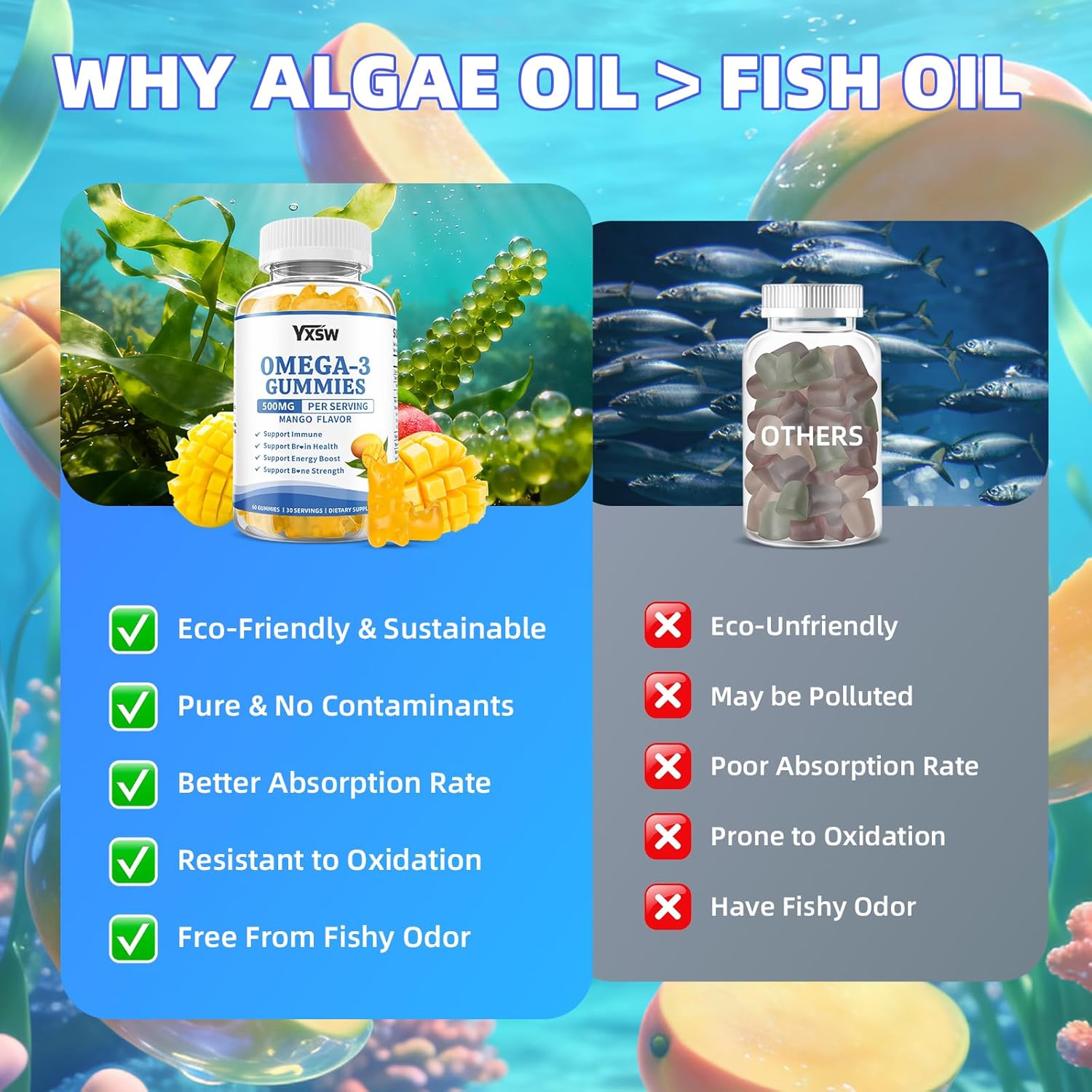 Vegan Omega-3 Gummies 500mg, Omega 3 Fish Oil Alternative for Adults with Plant-Based EPA & DHA & Vitamin A, C, E for Brain, Eye & Immune Health, Sugar Free, Mango Flavor, 60 Count